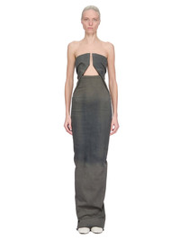 RICK OWENS FW25 CONCORDIANS PRONG GOWN IN DARKDUST DEGRADE DRKDUST DEGRADE SLUB STRETCH DENIM THIS PRONG GOWN IS FLOOR LENGTH. IT FEATURES A STRAPLESS STRUCTURED BODICE WITH A BONED GEOMETRIC CUTOUT FRONT AND FOLDED BUST DETAIL. IT HAS A TIGHT FITTING SKIRT WHICH TAPERS SLIGHTLY TO THE ANKLE WITH A HIGH CENTRE BACK SPLIT, AND EXPOSED ZIPPER CLOSURE THIS LIGHTWEIGHT DRKDUST DEGRADE DENIM IS MADE ON A 10OZ JAPANESE INDIGO AND NATURAL SLUB DENIM. THE READY GARMENT IS STONE WASHED WITH MINERAL DYES AND THEN SPRAYED BY HAND TO ACHIEVE THE DEGRADE COLORATION THIS FABRIC IS MADE USING GOTS CERTIFIED ORGANIC COTTON WHICH MEANS THE NATURAL FIBER IS GROWN WITHOUT HARMFUL CHEMICALS, LEAVING OUR SOIL, AIR AND WATER CLEANER FROM CONTAMINATES THIS GARMENT IS TREATED IN AN ITALIAN WASH HOUSE BASED IN THE VENETO AREA OF ITALY, THAT PRODUCES IN SMALLER TREATMENT BATHS TO REDUCE WATER WASTE AND UTILIZE A WATER PURIFYING PROCESS THAT ENABLES THEM TO RECYCLE A PORTION OF THE WATER USED. ALL OF OUR DENIM WASHES ARE ZDHC CERTIFIED COLOR: DARKDUST DEGRADE MATERIAL: 91% COTTON + 6% ELASTOMULTIESTER + 3% RUBBER FIBER INNER BUSTIER 97% COTTON + 3% ELASTANE MODEL IS 181CM TALL MODEL WEARS SIZE 38