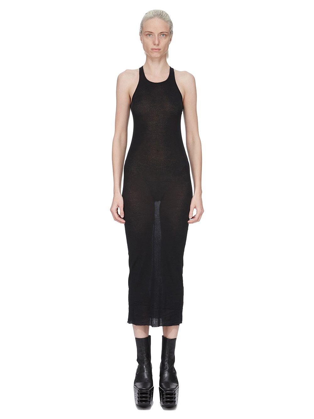 RICK OWENS FOREVER TANK DRESS IN BLACK MINI RIB JERSEY THIS TANK DRESS IS BELOW THE KNEE LENGTH WITH A CLOSE TO THE BODY FIT. IT HAS AN ROUND NECKLINE AND THIN SHOULDER STRAPS THAT FLOW INTO A SLIGHT RACER BACK. IT HAS A RAW CUT HEM AND FEATURES THE SIGNATURE SINGLE SEAM RUNNING DOWN THE CENTRE BACK SPINE THIS LIGHTWEIGHT MINI RIB JERSEY HAS A TEXTURED SURFACE AND SOFT HANDFEEL. THIS JERSEY IS MADE USING GOTS CERTIFIED ORGANIC COTTON WHICH MEANS THE NATURAL FIBER IS GROWN WITHOUT HARMFUL CHEMICALS, LEAVING OUR SOIL, AIR AND WATER CLEANER FROM CONTAMINATES WE STRIVE TO KEEP OUR PRODUCTION AS LOCAL AS POSSIBLE. THE FULL MANUFACTURING CYCLE OF THIS PRODUCT, FROM THE MATERIAL KNITTING TO SEWING AND FINISHING, WAS UNDERTAKEN CLOSE TO OUR HOME BASE IN CONCORDIA, ITALY. - FLAGSHIP STORES AND ONLINE EXCLUSIVE ITEM- COLOR: BLACK.- MATERIAL: 100% COTTON- MODEL IS WEARING SIZE 38- MODEL IS: 181 CM TALL