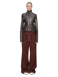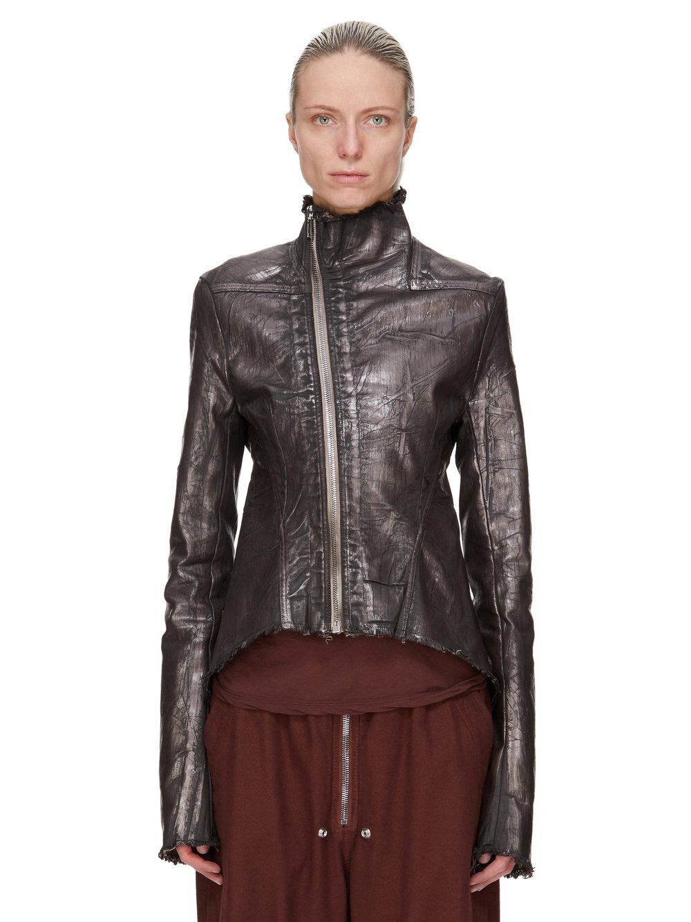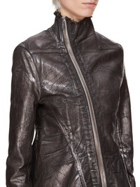 DRKSHDW FW25 CONCORDIANS NASKA GARY JKT IN BRONZE MEGACRUST STRETCH DENIM THIS NASKA GARY JACKET IS BELOW WAIST LENGTH WITH A SKIN TIGHT FIT. IT HAS LONG SLEEVES, A HIGH NECK WITH AN ASYMMETRICAL ZIP FRONT OPENING AND LEVEL SHOULDER SEAMS WITH TOPSTITCHING. IT FEATURES A CURVED NASKA HEMLINE THAT DIPS INTO TWO POINTS AT THE BACK AND HAS RAW CUT HEMS AND EDGES. THIS LIGHTWEIGHT BRONZE MEGACRUST DENIM IS MADE ON A 10OZ BLACK AND NATURAL STRETCH DENIM. THE READY GARMENT IS OVERDYED DRKDUST AND THEN TREATED WITH LAYERS OF BRONZE COLORED FOIL THAT IS PRESSED ON BY HAND THE NATURAL ASPECTS OF THIS TREATMENT MEANS THE FOIL APPLICATION IS IRREGULAR AND HAS PEELED OFF AND CRACKED IN CERTAIN AREAS AND WILL CONTINUE TO DO SO WITH WEAR AND ABRASION. THIS IS AN INHERENT CHARACTERISTIC OF THIS TYPE OF TREATMENT AND IS A DESIRED A VISUAL ASPECT WHICH ADDS TO THE UNIQUENESS OF EACH PIECE THIS GARMENT IS TREATED IN AN ITALIAN WASH HOUSE BASED IN THE VENETO AREA OF ITALY, THAT PRODUCES IN SMALLER TREATMENT BATHS TO REDUCE WATER WASTE AND UTILIZE A WATER PURIFYING PROCESS THAT ENABLES THEM TO RECYCLE A PORTION OF THE WATER USED. ALL OF OUR DENIM WASHES ARE ZDHC CERTIFIED COLOR: BRONZE MATERIAL: 91% COTTON + 6% ELASTOMULTIESTER + 3% RUBBER FIBER MODEL IS 181CM TALL MODEL WEARS SIZE S