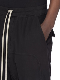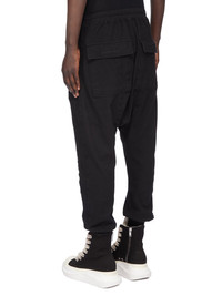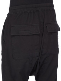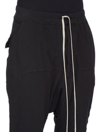 DRKSHDW FW25 CONCORDIANS PRISONER DRAWSTRING IN BLACK DOUBLE BRUSHED JERSEY THESE PRISONER DRAWSTRING PANTS ARE FULL LENGTH, WITH A RELAXED DROPPED CROTCH AND SLIM CUT LEGS. THEY HAVE AN ELASTICIZED WAISTBAND WITH DRAWSTRING AND STITCHED FLY, RIBBED ANKLE CUFFS, FRONT SIDE SEAM POCKETS AND SQUARE BACK POCKETS WITH FLAPS AND TOPSTITCHING. THEY FEATURE A CURVED YOKE SEAM RUNNING ACROSS THE FRONT AND DOWN EACH LEG. THIS MEDIUMWEIGHT COTTON JERSEY IS BRUSHED ON BOTH SIDES WHICH GIVES THE FABRIC A SOFT AND PEACHY HANDFEEL. THIS JERSEY IS GARMENT DYED THIS FABRIC IS MADE USING GOTS CERTIFIED ORGANIC COTTON WHICH MEANS THE NATURAL FIBER IS GROWN WITHOUT HARMFUL CHEMICALS, LEAVING OUR SOIL, AIR AND WATER CLEANER FROM CONTAMINATES COLOR: BLACK MATERIAL: 100% COTTON MODEL IS 189CM TALL MODEL WEARS SIZE S