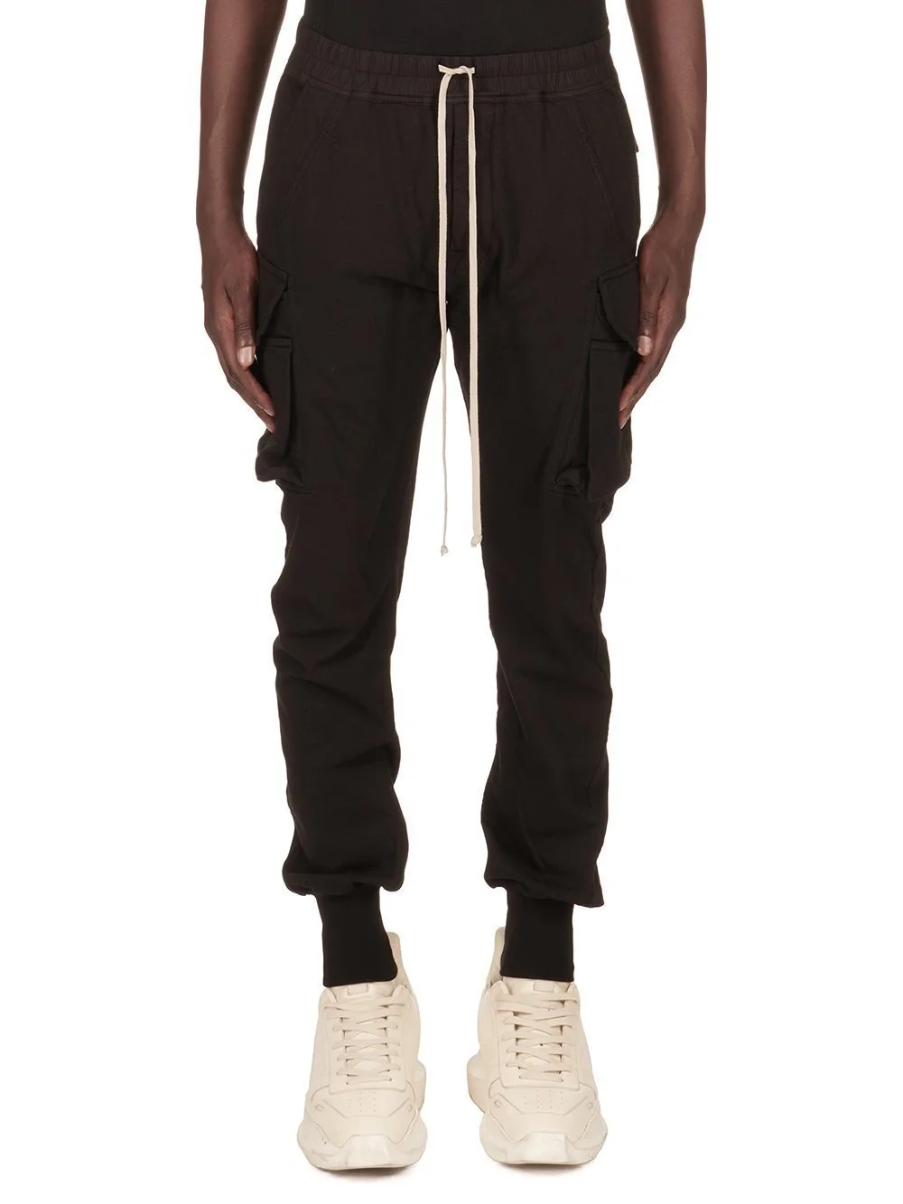 DRKSHDW FW25 CONCORDIANS MASTODON CUT IN BLACK COMPACT HEAVY JERSEY THESE MASTODON CUT PANTS ARE FULL LENGTH WITH A SLIM FIT. THEY HAVE AN ELASTICIZED WAISTBAND WITH DRAWSTRING AND ELASTICIZED CUFFS. THEY FEATURE TWO SIDE WELT POCKETS, TWO ZIPPERED CARGO POCKETS WITH BEVELED FLAPS ON THE OUTER THIGH, AND BACK PATCH POCKETS WITH FLAPS AND TOPSTITCHING. THIS HEAVYWEIGHT AND COMPACT COTTON JERSEY HAS A BRUSHED AND SOFT HANDFEEL. THIS JERSEY IS GARMENT DYED THIS FABRIC IS MADE USING GOTS CERTIFIED ORGANIC COTTON WHICH MEANS THE NATURAL FIBER IS GROWN WITHOUT HARMFUL CHEMICALS, LEAVING OUR SOIL, AIR AND WATER CLEANER FROM CONTAMINATES COLOR: BLACK MATERIAL: 100% COTTONBAND 97% COTTON + 3% ELASTANE MODEL IS 189CM TALL MODEL WEARS SIZE S