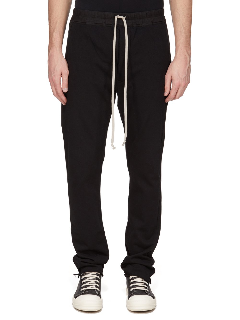 DRKSHDW FW25 CONCORDIANS BERLIN DRAWSTRING IN BLACK COMPACT HEAVY JERSEY THESE BERLIN DRAWSTRING PANTS ARE FULL LENGTH. THEY HAVE AN ELASTICIZED WAISTBAND WITH DRAWSTRING AND STITCHED FLY. THEY HAVE SIDE FRONT POCKETS, BACK PATCH POCKETS WITH FLAPS AND TOPSTITCHING AND SMALL SLITS IN THE OUTER ANKLE SEAM. THIS HEAVYWEIGHT AND COMPACT COTTON JERSEY HAS A BRUSHED AND SOFT HANDFEEL. THIS JERSEY IS GARMENT DYED THIS FABRIC IS MADE USING GOTS CERTIFIED ORGANIC COTTON WHICH MEANS THE NATURAL FIBER IS GROWN WITHOUT HARMFUL CHEMICALS, LEAVING OUR SOIL, AIR AND WATER CLEANER FROM CONTAMINATES COLOR: BLACK MATERIAL: 100% COTTONBAND 97% COTTON + 3% ELASTANE MODEL IS 189CM TALL MODEL WEARS SIZE S