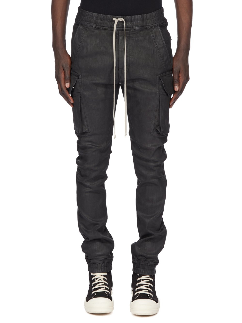 DRKSHDW FW25 CONCORDIANS MASTODON CUT IN BLACK WAX STRETCH DENIM THESE MASTODON CUT PANTS ARE FULL LENGTH WITH A SLIM FIT. THEY HAVE AN ELASTICIZED WAISTBAND WITH DRAWSTRING AND ELASTICIZED CUFFS. THEY FEATURE TWO SIDE WELT POCKETS, TWO ZIPPERED CARGO POCKETS WITH BEVELED FLAPS ON THE OUTER THIGH, AND BACK PATCH POCKETS WITH FLAPS AND TOPSTITCHING. THIS LIGHTWEIGHT BLACK WAX DENIM IS MADE ON A 10OZ BLACK AND NATURAL STRETCH DENIM. THE READY GARMENT IS OVERDYED BLACK AND TREATED WITH A WAX FINISH. A FINAL WASH GIVES THIS GARMENT ITS SOFTNESS THIS GARMENT IS TREATED IN AN ITALIAN WASH HOUSE BASED IN THE VENETO AREA OF ITALY, THAT PRODUCES IN SMALLER TREATMENT BATHS TO REDUCE WATER WASTE AND UTILIZE A WATER PURIFYING PROCESS THAT ENABLES THEM TO RECYCLE A PORTION OF THE WATER USED. ALL OF OUR DENIM WASHES ARE ZDHC CERTIFIED COLOR: BLACK WAX MATERIAL: 91% COTTON + 6% ELASTOMULTIESTER + 3% RUBBER FIBER POCKETS LINING 100% COTTONMODEL IS 189CM TALL MODEL WEARS SIZE S