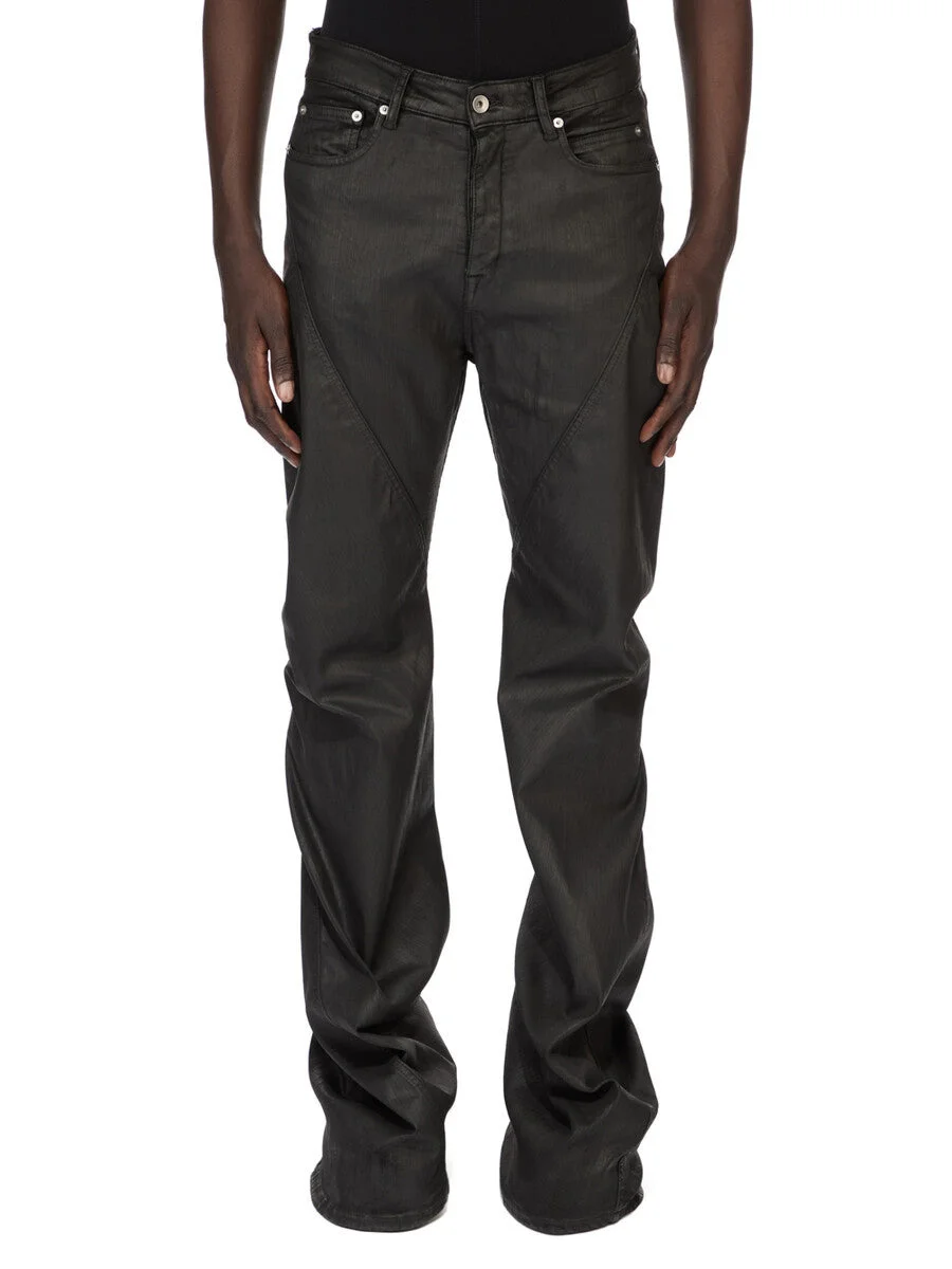 DRKSHDW SS26 TEMPLE BIAS BOOTCUT IN BLACK DEEP BLACK STRETCH DENIM THESE BIAS BOOTCUT JEANS ARE A STRAIGHT FIT MID-RISE 6 POCKET JEAN WITH A FLOOR LENGTH SLIGHT BOOTCUT. THEY HAVE A CONCEALED BUTTON FLY, A WAISTBAND WITH BELT LOOPS AND POCKET RIVETS AND REAR PATCH POCKETS WITH TOPSTITCHING. THEY FEATURE A BIAS CUT PANEL WITH SEAMS THAT WRAP AROUND THE LEG TWICE. THIS MEDIUMWEIGHT 13OZ DENIM IS OVERDYED AND HAS A SOFT AND WASHED HANDFEEL. THIS FABRIC IS MADE USING GOTS CERTIFIED ORGANIC COTTON WHICH MEANS THE NATURAL FIBER IS GROWN WITHOUT HARMFUL CHEMICALS, LEAVING OUR SOIL, AIR AND WATER CLEANER FROM CONTAMINATES. COLOR: BLACK MATERIAL:91% COTTON + 6% ELASTOMULTIESTER + 3% RUBBER FIBER POCKETS LINING 100% COTTON MODEL IS 189CM TALL MODEL WEARS SIZE 31