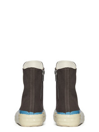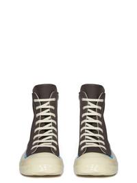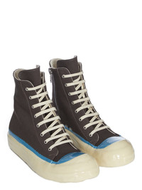 DRKSHDW FW25 CONCORDIANS SNEAKS IN DRKDUST/BLUE/LIGHT BEIGE 13OZ OVERDYED DENIM THESE SNEAKS ARE ABOVE ANKLE HEIGHT AND FEATURE EIGHT EYELETS, LACES, A ZIPPER ON THE INSIDE ANKLE FOR EASY FASTENING, TOE CAPS AND SHARK TOOTH SOLES. THIS MEDIUMWEIGHT 13OZ DENIM IS OVERDYED AND HAS A SOFT AND WASHED HANDFEEL THIS FABRIC IS MADE USING GOTS CERTIFIED ORGANIC COTTON WHICH MEANS THE NATURAL FIBER IS GROWN WITHOUT HARMFUL CHEMICALS, LEAVING OUR SOIL, AIR AND WATER CLEANER FROM CONTAMINATES THESE SHOES HAVE BEEN TREATED WITH A RESISTANT SILICONE. THE SHOES ARE DIPPED BY HAND AND LEFT TO TRY MULTIPLE TIMES IN ORDER TO ACHIEVE THE MULTICOLORED EFFECT COLOR: DRKDUST/BLUE/LIGHT BEIGE MATERIAL: UPPER 100% COTTON TOE 70% POLYURETHANE + 30% VISCOSE LINING 100% COTTON SOLE HEIGHT 3.5CM