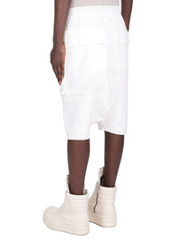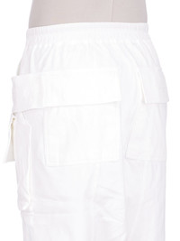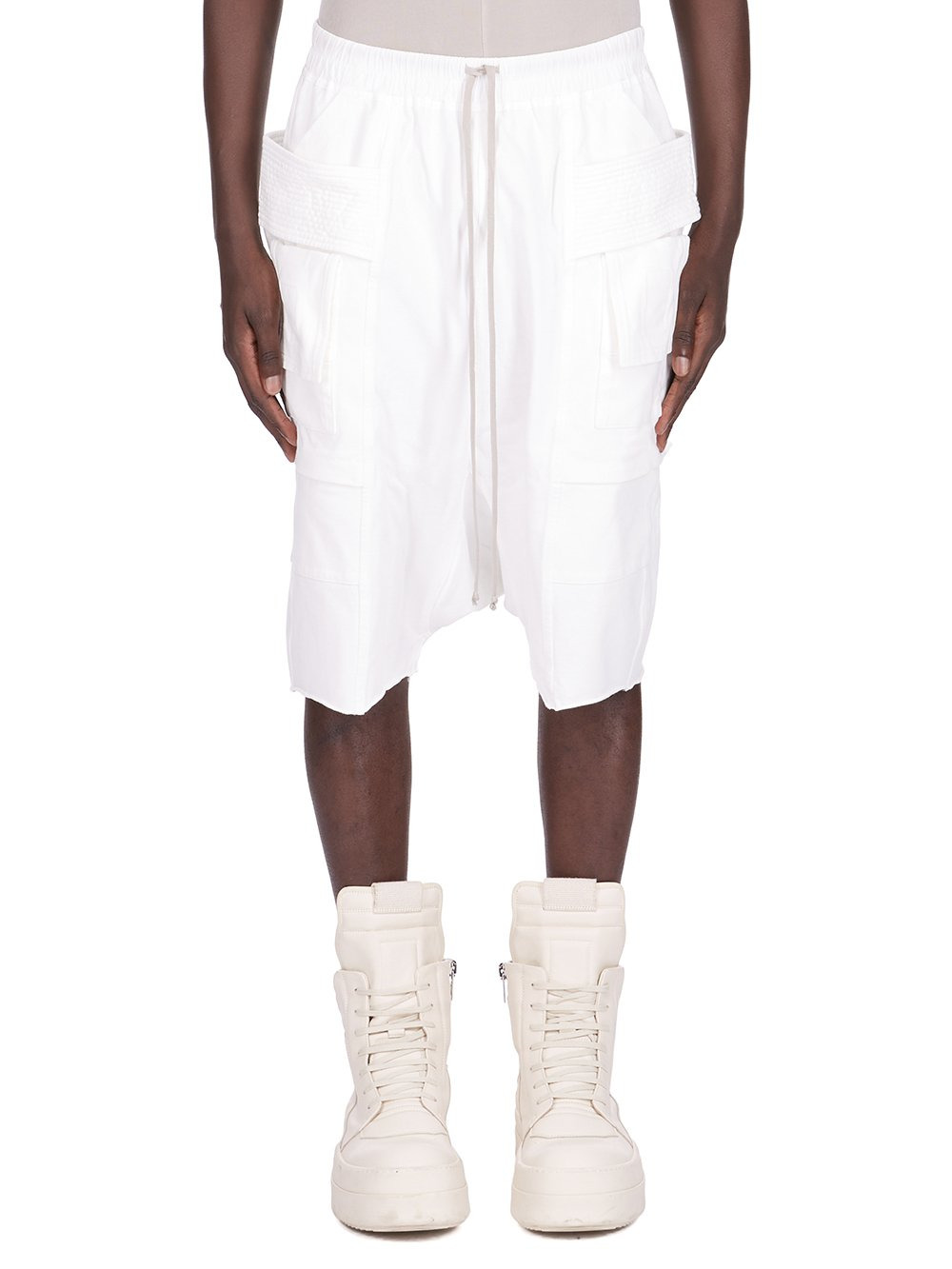 DRKSHDW FW25 CONCORDIANS CREATCH CARGO PODS IN MILK COMPACT HEAVY JERSEY THESE CREATCH CARGO PODS. ARE BELOW KNEE LENGTH, WITH A DROPPED CROTCH AND WIDE CENTRE PANEL. THEY HAVE AN ELASTICIZED WAISTBAND WITH DRAWSTRING AND STITCHED FLY. THEY FEATURE LAYERED FRONT POCKETS WITH SIDE BELT STRAPS WITH SIGNATURE STITCHING LINES AND TWO FLAP POCKETS WITH FLAPS AND TOPSTITCHING. THIS HEAVYWEIGHT AND COMPACT COTTON JERSEY HAS A BRUSHED AND SOFT HANDFEEL. THIS JERSEY IS GARMENT DYED THIS FABRIC IS MADE USING GOTS CERTIFIED ORGANIC COTTON WHICH MEANS THE NATURAL FIBER IS GROWN WITHOUT HARMFUL CHEMICALS, LEAVING OUR SOIL, AIR AND WATER CLEANER FROM CONTAMINATES COLOR: MILK MATERIAL: 100% COTTONBAND 97% COTTON + 3% ELASTANE MODEL IS 189CM TALL MODEL WEARS SIZE S