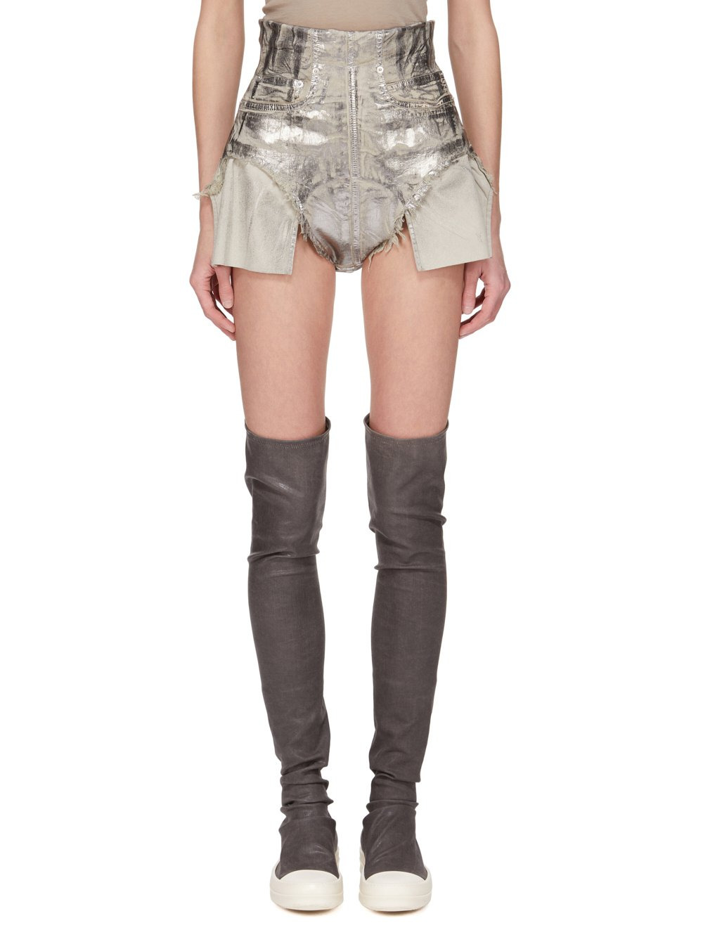 DRKSHDW FW25 CONCORDIANS DIRT CUTOFFS IN PALLADIUM FOIL STRETCH DENIM THESE DIRT CUTOFFS ARE CUT HIGH ON THE HIP WITH A TIGHT FIT. THEY HAVE AN EXTRA HIGH WAIST, FRONT JEAN POCKETS WITH RIVETS, BACK JET POCKETS AND POCKET BAG LININGS WHICH HANG BELOW THE RAW CUT HEMS, FRONT AND BACK. THEY HAVE DOUBLE TOPSTITCHED DENIM SEAMS AND OPEN WITH A CENTRE BACK ZIPPER. THIS LIGHTWEIGHT STRETCH DENIM IS OVERDYED AND TREATED WITH A PALLADIUM FOIL OVERLAY AND WASHED TO ACHIEVE THE IRREGULAR LOOK SINCE THE FOIL IS PRESSED ON TOP OF THE FINAL GARMENTS, EACH PIECE WILL HAVE ITS OWN UNIQUE LOOK AND CREASES SINCE THE FOIL WILL ATTACH TO DIFFERENT PLACES DEPENDING ON THE GARMENT THIS GARMENT IS TREATED IN AN ITALIAN WASH HOUSE BASED IN THE VENETO AREA OF ITALY, THAT PRODUCES IN SMALLER TREATMENT BATHS TO REDUCE WATER WASTE AND UTILIZE A WATER PURIFYING PROCESS THAT ENABLES THEM TO RECYCLE A PORTION OF THE WATER USED. ALL OF OUR DENIM WASHES ARE ZDHC CERTIFIED COLOR: PALLADIUM MATERIAL: 90% COTTON + 7% POLYESTER + 3% RUBBER FIBER MODEL IS 181CM TALL MODEL WEARS SIZE S
