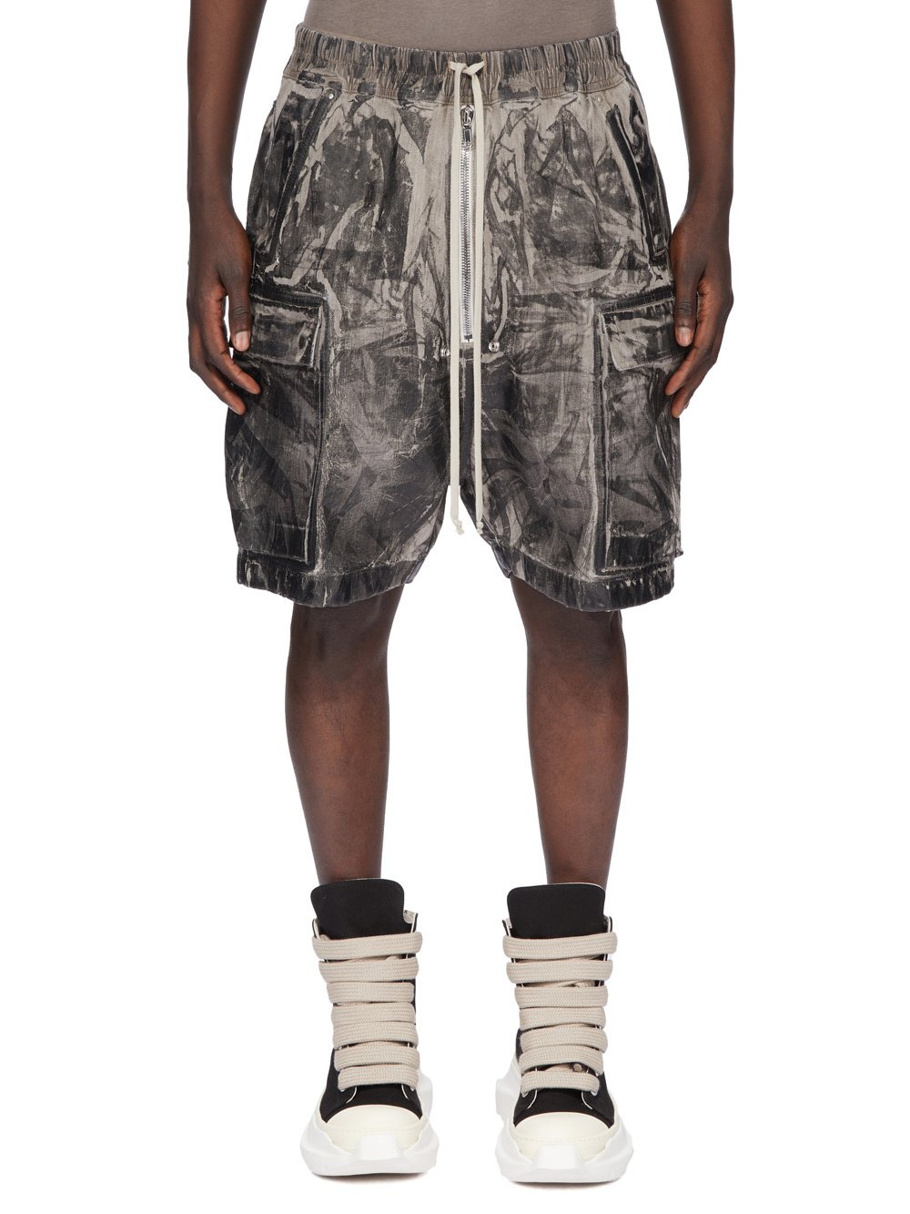 DRKSHDW FW25 CONCORDIANS CARGOBELA SHORTS IN 13OZ BLACK WASHED FOIL DENIM THESE CARGOBELA SHORTS ARE KNEE-LENGTH, WITH A LOW CROTCH AND WIDE LEG. THEY FEATURE AN ELASTICIZED WAISTBAND WITH DRAWSTRING AND A BELA EXPOSED CENTER ZIPPER WITH TWO SNAP DETAIL AT BOTTOM. THEY FEATURE TWO BEVELED CARGO POCKETS ON THE SIDE LEG WITH TWO REAR WELT POCKETS, ALL WITH CONCEALED SNAPS AND TOPSTITCHING. THIS MEDIUMWEIGHT WASHED FOIL DENIM IS MADE ON A 13OZ JAPANESE BLACK AND NATURAL DENIM. THE READY GARMENT IS BLEACHED INTO A DIRTY PEARL COLOR, A BLACK FOIL OVERLAY IS THEN APPLIED AND FINALLY THE GARMENT IS WASHED TO ACHIEVE THE IRREGULAR LOOK THE NATURAL ASPECTS OF THIS TREATMENT MEANS THE FOIL APPLICATION IS IRREGULAR AND HAS PEELED OFF IN CERTAIN AREAS AND WILL CONTINUE TO DO SO WITH WEAR AND ABRASION. THIS IS AN INHERENT CHARACTERISTIC OF THIS TYPE OF TREATMENT AND IS A DESIRED VISUAL ASPECT WHICH ADDS TO THE UNIQUENESS OF EACH PIECE THIS GARMENT IS TREATED IN AN ITALIAN WASH HOUSE BASED IN THE VENETO AREA OF ITALY, THAT PRODUCES IN SMALLER TREATMENT BATHS TO REDUCE WATER WASTE AND UTILIZE A WATER PURIFYING PROCESS THAT ENABLES THEM TO RECYCLE A PORTION OF THE WATER USED. ALL OF OUR DENIM WASHES ARE ZDHC CERTIFIED COLOR: BLACK WASHED FOIL MATERIAL: 100% COTTON BAND 91% COTTON + 6% ELASTOMULTIESTER + 3% RUBBER FIBER POCKETS LINING 52% POLYESTER + 48% COTTON MODEL IS 189CM TALL MODEL WEARS SIZE S