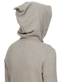 DRKSHDW FW25 CONCORDIANS MOUNTAIN HOODIE IN MELANGE GREY FELPA JERSEY THIS MOUNTAIN HOODIE IS ABOVE HIP LENGTH WITH LONG SLEEVES. IT HAS A CURVED ASYMMETRICAL ZIPPER CLOSURE, A SMALL FUNNEL NECK AND A LARGE POINTED HOOD. IT HAS TWO FRONT PATCH POCKETS, RIBBED CUFFS AND WAISTBAND SIGNATURE SINGLE SEAM RUNNING DOWN THE CENTRE BACK SPINE. THIS HEAVYWEIGHT COTTON AND POLYESTER BLEND MELANGE JERSEY HAS A SOFT HANDFEEL THIS FABRIC IS MADE USING GOTS CERTIFIED ORGANIC COTTON WHICH MEANS THE NATURAL FIBER IS GROWN WITHOUT HARMFUL CHEMICALS, LEAVING OUR SOIL, AIR AND WATER CLEANER FROM CONTAMINATES COLOR: MELANGE GREY MATERIAL: 84% COTTON + 16% POLYESTER KNIT RIB CUFFS AND BOTTOM 57% COTTON + 38% POLYESTER + 5% ELASTANEMODEL IS 189CM TALL MODEL WEARS SIZE S