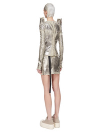 DRKSHDW FW25 CONCORDIANS TEC TOP IN PALLADIUM FOIL STRETCH DENIM THIS TEC TOP IS HIP LENGTH WITH LONG, SLIM SLEEVES AND A BODY HUGGING FIT. IT FEATURES EXAGGERATED TEC SHOULDERS WHICH RISE INTO RAW CUT POINTS AND A GEOMETRIC LINE DETAIL ON FRONT. IT CLOSES WITH A ZIPPER, WITH PULL TAB, ON CENTRE BACK. THIS LIGHTWEIGHT STRETCH DENIM IS OVERDYED AND TREATED WITH A PALLADIUM FOIL OVERLAY AND WASHED TO ACHIEVE THE IRREGULAR LOOK SINCE THE FOIL IS PRESSED ON TOP OF THE FINAL GARMENTS, EACH PIECE WILL HAVE ITS OWN UNIQUE LOOK AND CREASES SINCE THE FOIL WILL ATTACH TO DIFFERENT PLACES DEPENDING ON THE GARMENT THIS GARMENT IS TREATED IN AN ITALIAN WASH HOUSE BASED IN THE VENETO AREA OF ITALY, THAT PRODUCES IN SMALLER TREATMENT BATHS TO REDUCE WATER WASTE AND UTILIZE A WATER PURIFYING PROCESS THAT ENABLES THEM TO RECYCLE A PORTION OF THE WATER USED. ALL OF OUR DENIM WASHES ARE ZDHC CERTIFIED COLOR: PALLADIUM MATERIAL: 90% COTTON + 7% POLYESTER + 3% RUBBER FIBER MODEL IS 181CM TALL MODEL WEARS SIZE S