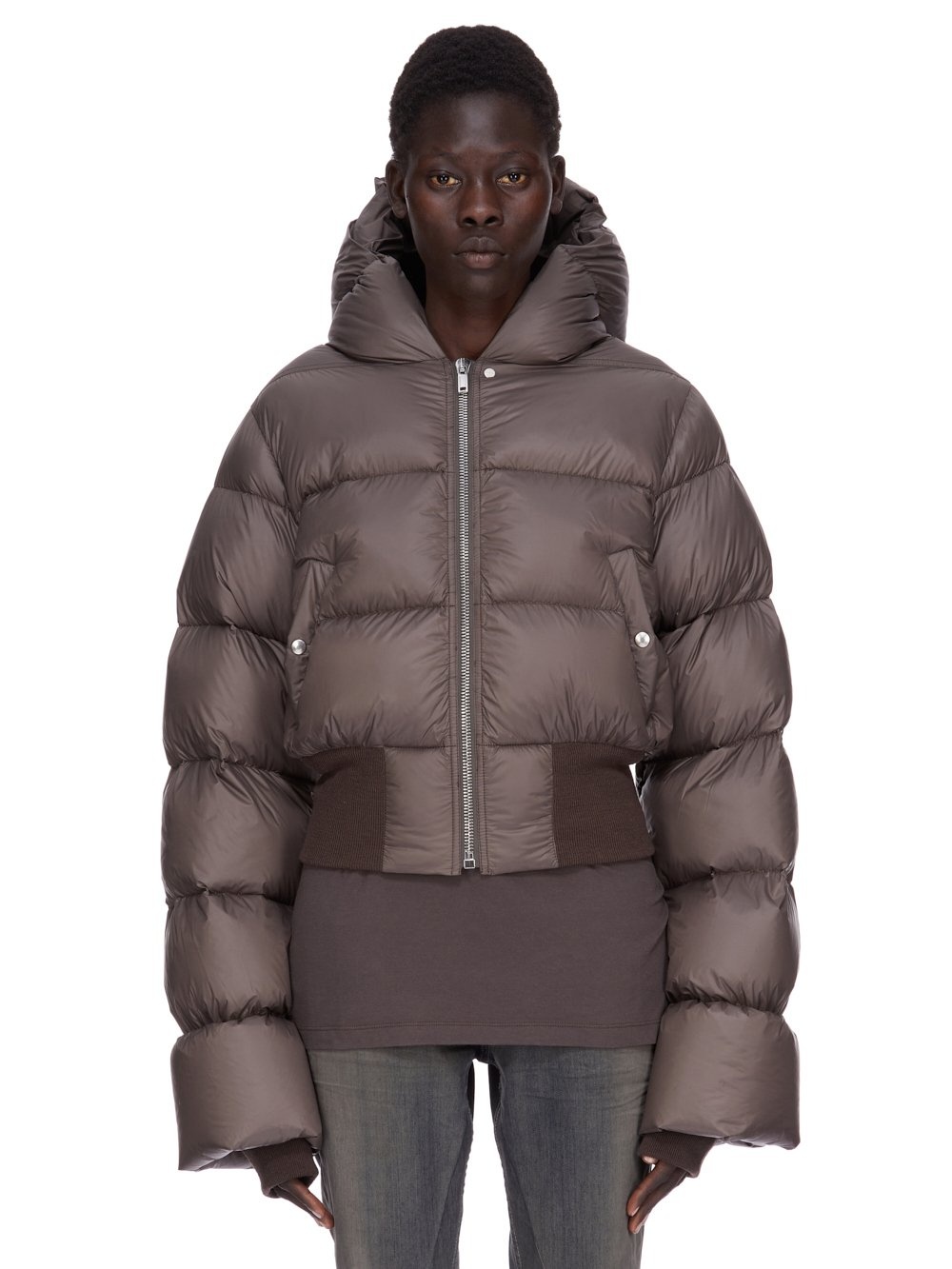 RICK OWENS FW25 CONCORDIANS HOODED JKT IN DARKDUST LIGHT NYLON THIS HOODED JKT IS CROPPED BELOW THE WAIST WITH A CENTRE FRONT ZIPPER, WITH TOP SNAP CLOSURE AND A HOOD. IT IS PADDED AND QUILTED WITH HORIZONTAL STITCHING LINES AND HAS SIDE FRONT WELT POCKETS WITH SNAPS, A WIDE RIBBED WAISTBAND RIBBED WRISTS. IT FEATURES A SIGNATURE COTTON WEBBING STRAP, WITH RIVET DETAIL, ACROSS THE BACK YOKE THIS AIRY AND LIGHTWEIGHT NYLON IS MADE USING GRS CERTIFIED RECYCLED NYLON WHICH ENSURES A REDUCTION IN WATER CONSUMPTION, EMISSIONS AND HAZARDOUS WASTE, LESSENING THE DEPENDENCE ON NON-RENEWABLE RESOURCES COLOR: DARKDUST MATERIAL: 100% NYLON KNIT RIB BOTTOM AND CUFFS 100% NEW WOOL POCKETS LINING 100% COTTON PADDING 90% GOOSE DOWN + 10% MALLARD FEATHERS MODEL IS 181CM TALL MODEL WEARS SIZE 40