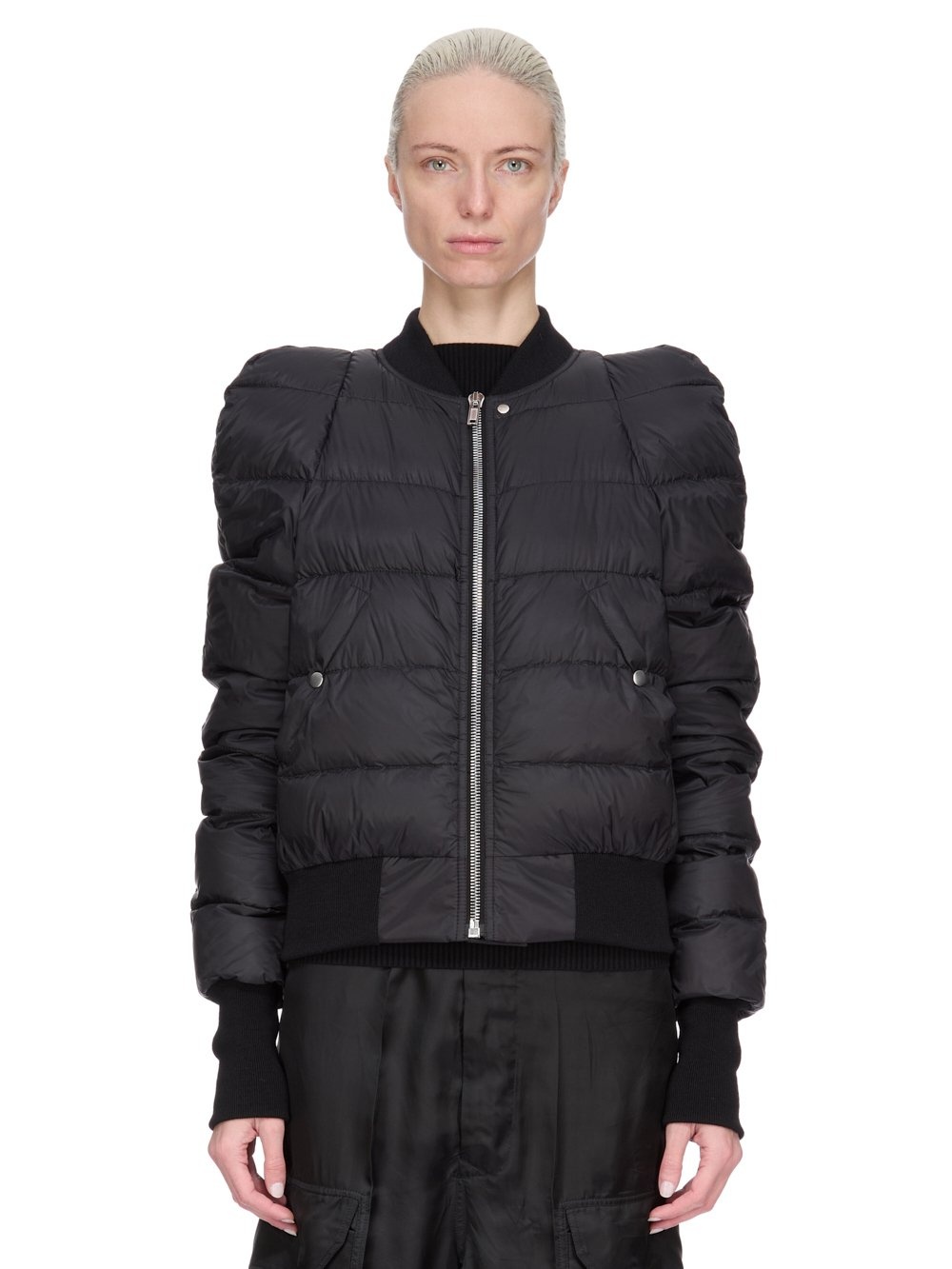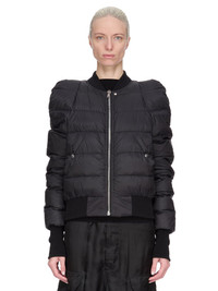 RICK OWENS FW25 CONCORDIANS DUVET FLIGHT IN BLACK LIGHT NYLON THIS DUVET FLIGHT IS HIP LENGTH WITH LONG SLEEVES. IT HAS A CENTRE FRONT ZIPPER WITH TOP SNAP AND A RIBBED COLLAR, CUFFS AND WAISTBAND. IT FEATURES ROUNDED SHOULDERS AND HORIZONTAL STITCHING LINES. THIS AIRY AND LIGHTWEIGHT NYLON IS MADE USING GRS CERTIFIED RECYCLED NYLON WHICH ENSURES A REDUCTION IN WATER CONSUMPTION, EMISSIONS AND HAZARDOUS WASTE, LESSENING THE DEPENDENCE ON NON-RENEWABLE RESOURCES COLOR: BLACK MATERIAL: 100% NYLON KNIT RIB COLLAR, WRIST BAND AND BOTTOM 100% NEW WOOL PADDING 90% GOOSE DOWN + 10% MALLARD FEATHERS MODEL IS 181CM TALL MODEL WEARS SIZE 40