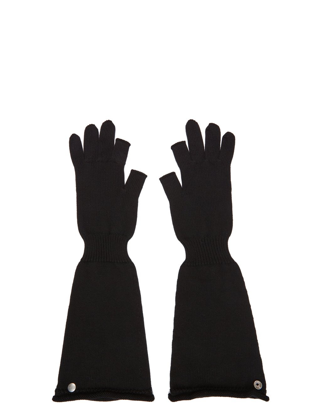 RICK OWENS FW25 CONCORDIANS SPHINX GLOVES IN BLACK LIGHTWEIGHT RASATO KNIT THESE SPHINX GLOVES ARE MID-FOREARM LENGTH. THEY FEATURE KNIT HOLES FOR THE THUMB AND INDEX FINGER, THEY HAVE A RIBBED CUFF AT THE WRIST AND THEN EXTEND UP THE FOREARM. THEY HAVE A VISIBLE SILVER SNAP TO ATTACH THE PAIR TOGETHER THIS LIGHTWEIGHT AND CLASSIC STITCH WOOL KNIT HAS A SOFT HANDFEEL COLOR: BLACK MATERIAL: 100% NEW WOOL MODEL IS 189CM TALL ITEM IS AVAILABLE IN ONE SIZE