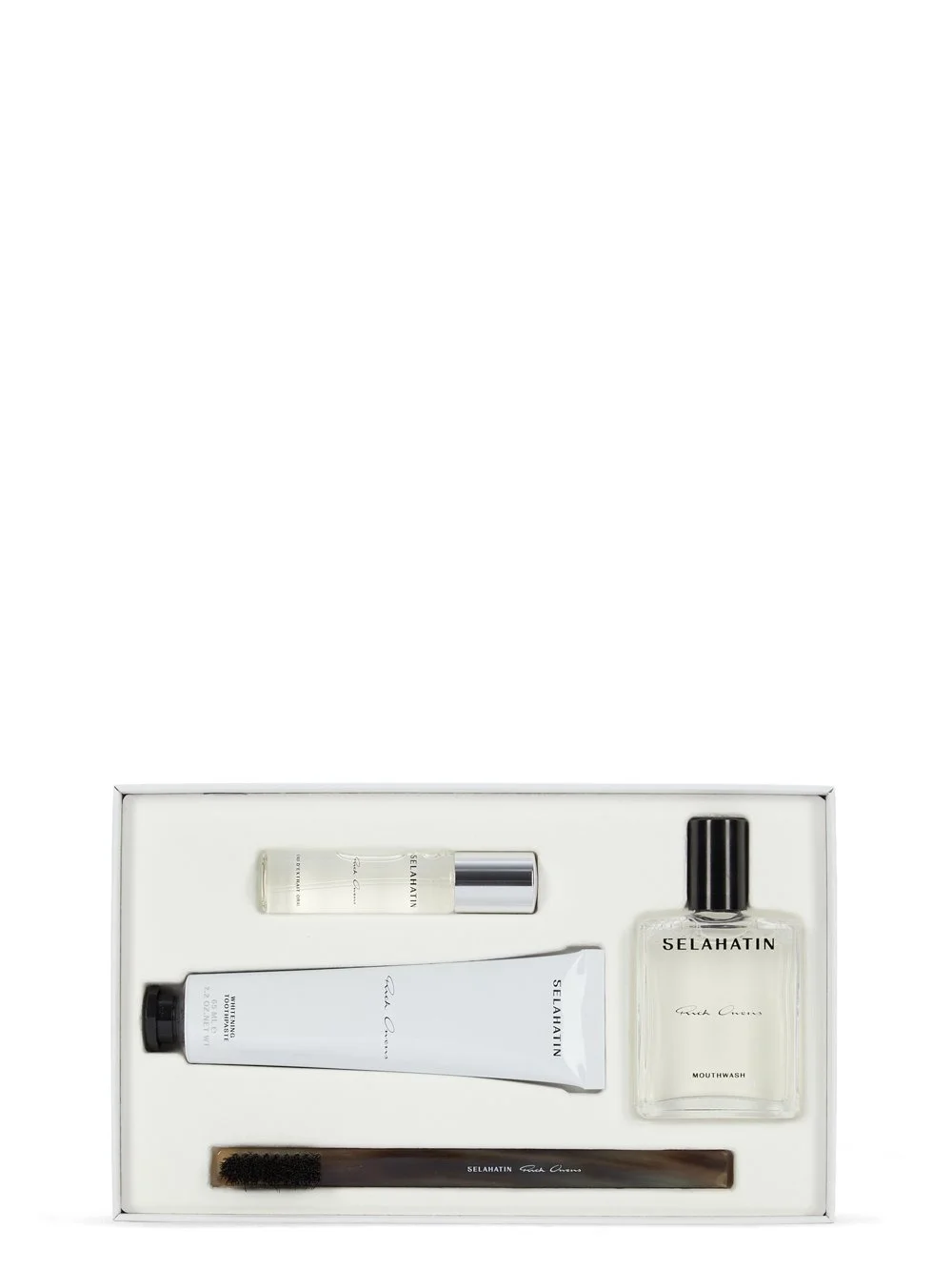 SELAHATIN X RICK OWENS TRAVEL SET THIS SELAHATIN X RICK OWENS TRAVEL SET COMPRISES OF A HANDCRAFTED HORN TOOTHBRUSH WITH BOAR BRISTLES, A TUBE OF REJUVENATING, WHITENING TOOTHPASTE, A GLASS BOTTLE OF TRAVEL MOUTHWASH AND A GLASS BOTTLE OF EAU D'EXTRAIT ORAL MOUTHSPRAY. EACH ITEM HAS TOP NOTES OF VERBENA, MADAGASCAR VANILLA AND SICHUAN PEPPER, HEART NOTES OF JUNIPER, DARK CITRUS AND ROSEMARY ON A BLACK PEPPER AND PEPPERMINT BASE THE ITEMS IN THIS TRAVEL SET HAVE ANTI-INFLAMMATORY AND ANTI-OXIDANT PROPERTIES FAVORABLE FOR STRENGTHENING THE SKIN BARRIER AGAINST FREE RADICALS, BATTLING BAD BREATH AND PROTECTING THE TEETH'S ENAMEL. THEY FIGHT BACTERIA AND PROVIDE PROACTIVE CARE FOR SENSITIVE TEETH. THE TOOTHBRUSH HAS A HANDCRAFTED NATURAL HORN HANDLE AND AUTHENTIC BOAR BRISTLE HEAD. DUE TO HORN BEING A LIVING MATERIAL, COLORS AND NUANCE MAY DIFFER. MAKING EACH TOOTHBRUSH UNIQUE THIS CAPSULE COLLECTION FEATURES A CUSTOMIZED AROMA DEVELOPED BY SELAHATIN FOR RICK OWENS TOOTHPASTE SIZE 65 MLMOUTHWASH SIZE 50 MLEAU D’EXTRAIT SIZE 17.5 ML