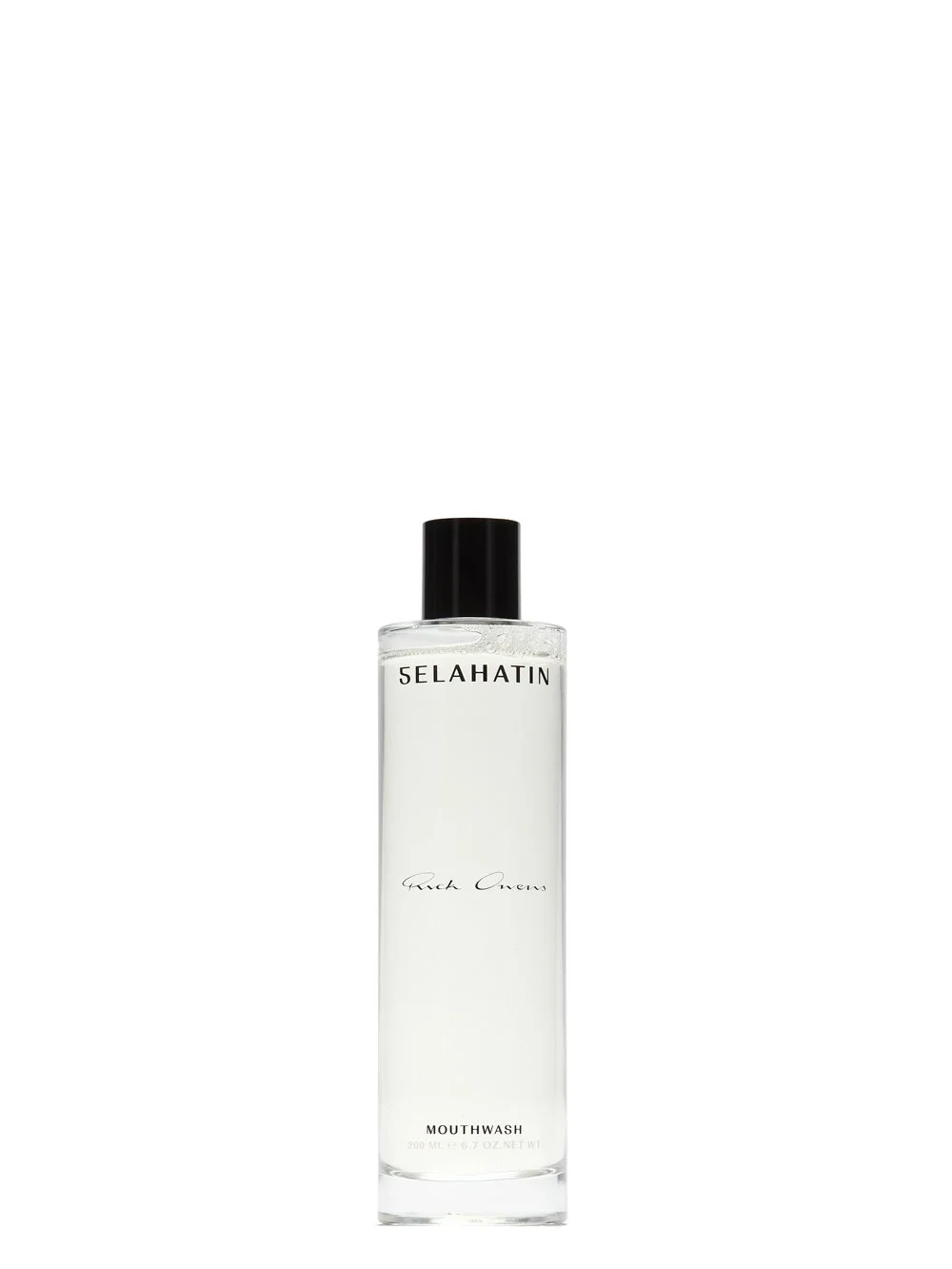 SELAHATIN X RICK OWENS MOUTHWASH THIS SELAHATIN X RICK OWENS MOUTHWASH COMES IN A GLASS BOTTLE AND HAS TOP NOTES OF VERBENA, MADAGASCAR VANILLA AND SICHUAN PEPPER, HEART NOTES OF JUNIPER, DARK CITRUS AND ROSEMARY ON A BLACK PEPPER AND PEPPERMINT BASE THIS MOUTHWASH HAS ANTI-INFLAMMATORY AND ANTI-OXIDANT PROPERTIES FAVORABLE FOR STRENGTHENING THE SKIN BARRIER AGAINST FREE RADICALS, BATTLING BAD BREATH AND PROTECTING THE TEETH'S ENAMEL. IT FIGHTS BACTERIA AND PROVIDES PROACTIVE CARE FOR SENSITIVE TEETH SIZE 200 ML INGREDIENTS:AQUA/[WATER] GLYCERIN PVP POLOXAMER 407 POLYSORBATE 20 PROPYLENE GLYCOL PEG-40 HYDROGENATED CASTOR OIL SODIUM CITRATE POTASSIUM SORBATE SODIUM BENZOATE AROMA/[FLAVOR] SODIUM PHOSPHATE TOCOPHERYL ACETATE DISODIUM PHOSPHATE PANTHENOL MENTHOL ALOE BARBADENSIS LEAF JUICE POWDER BISABOLOL CETYLPYRIDINIUM CHLORIDE SODIUM SACCHARIN ROSMARINUS OFFICINALIS LEAF EXTRACT/[ROSMARINUS OFFICINALIS (ROSEMARY) LEAF EXTRACT] LIMONENE JUNIPERUS COMMUNIS FRUIT OIL PINENE BETA-CARYOPHYLLENE CITRAL CITRUS PARADISI PEEL OIL/[CITRUS PARADISI (GRAPEFRUIT) PEEL OIL]"