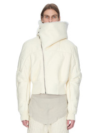 RICK OWENS FW25 CONCORDIANS CROPPED HOODED FLIGHT IN MILK ALBINO SHEARLING THIS CROPPED HOODED FLIGHT IS ABOVE-HIP LENGTH WITH LONG SLEEVES. IT HAS A FRONT ZIP SLOPING FROM THE CENTRE HEM TO THE RIGHT SIDE OF THE NECK WITH A LARGE HOOD THAT CLOSES WITH SNAPS. IT FEATURES GIRDERED LEVEL SHOULDERS, AND A YOKE THAT ARCS FROM THE CENTRE CHEST, OVER THE SHOULDER TO FINISH IN SQUARE POINTS ON THE UPPER ARM. IT FEATURES A ZIPPERED POCKETS ON BOTH FOREARMS. THIS VERSION FEATURES A SOFT NATURAL LENGTH SHORT FUR ON THE INSIDE THIS HEAVYWEIGHT SHEARLING LAMB LEATHER HAS A SEMI SHINY, WAXY NAPPA FINISH AND A SOFT NATURAL LENGTH FUR TANNED IN THE TUSCANY AREA OF ITALY USING A METAL FREE TANNING PROCESS, THESE SHEARLING MERINO HIDES ARE OF SPANISH ORIGIN, THE UNIQUE THICK FUR OF THESE ANIMALS MAKE THEM PERFECT FOR SHEARLING. BECAUSE THE HAIR IS NATURAL, THERE WILL BE VARIATIONS IN HAIR LENGTH AND TEXTURE, MAKING EACH PIECE UNIQUE THIS TANNERY IS LWG CERTIFIED WITH A SILVER RATING COLOR: MILK MATERIAL: 100% LAMB SHEARLING REAL FUR KNIT RIB CUFFS AND BOTTOM 94% NEW WOOL + 5% NYLON + 1% ELASTANE INTERNAL EDGES 100% CALF LEATHER POCKETS LINING 100% COTTON MODEL IS 189CM TALL MODEL WEARS SIZE 48