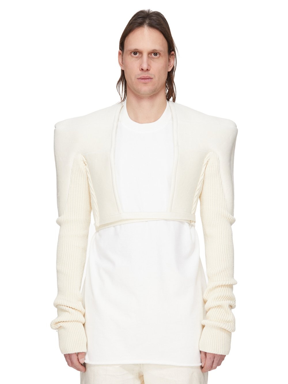 RICK OWENS FW25 CONCORDIANS RUNWAY TIGHT JKT IN MILK ALBINO SHEARLING THIS TIGHT JKT IS WAIST LENGTH. IT IS CLOSE-FITTING, WITH LONG, RIB KNIT SLEEVES, AND AN OPEN FRONT THAT SECURES WITH A LONG TIE THAT THEN WRAPS AROUND THE WAIST. IT FEATURES STRUCTURED, WIDE TATLIN SHOULDERS WITH A GIRDERED SHOULDER SEAM, AND YOKE THAT IS HORIZONTAL ACROSS THE CHEST AND DESCENDS DOWN THE ARM, TO FINISH IN A BLUNT POINT AT THE ELBOW THIS HEAVYWEIGHT SHEARLING LAMB LEATHER HAS A SEMI SHINY, WAXY NAPPA FINISH AND A SOFT NATURAL LENGTH FUR TANNED IN THE TUSCANY AREA OF ITALY USING A METAL FREE TANNING PROCESS, THESE SHEARLING MERINO HIDES ARE OF SPANISH ORIGIN, THE UNIQUE THICK FUR OF THESE ANIMALS MAKE THEM PERFECT FOR SHEARLING. BECAUSE THE HAIR IS NATURAL, THERE WILL BE VARIATIONS IN HAIR LENGTH AND TEXTURE, MAKING EACH PIECE UNIQUE THIS TANNERY IS LWG CERTIFIED WITH A SILVER RATING COLOR: MILK MATERIAL: 100% LAMB SHEARLING REAL FUR KNIT RIB BACK AND SLEEVES 96% NEW WOOL + 3% NYLON + 1% ELASTANE MODEL IS 189CM TALL MODEL WEARS SIZE 48