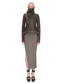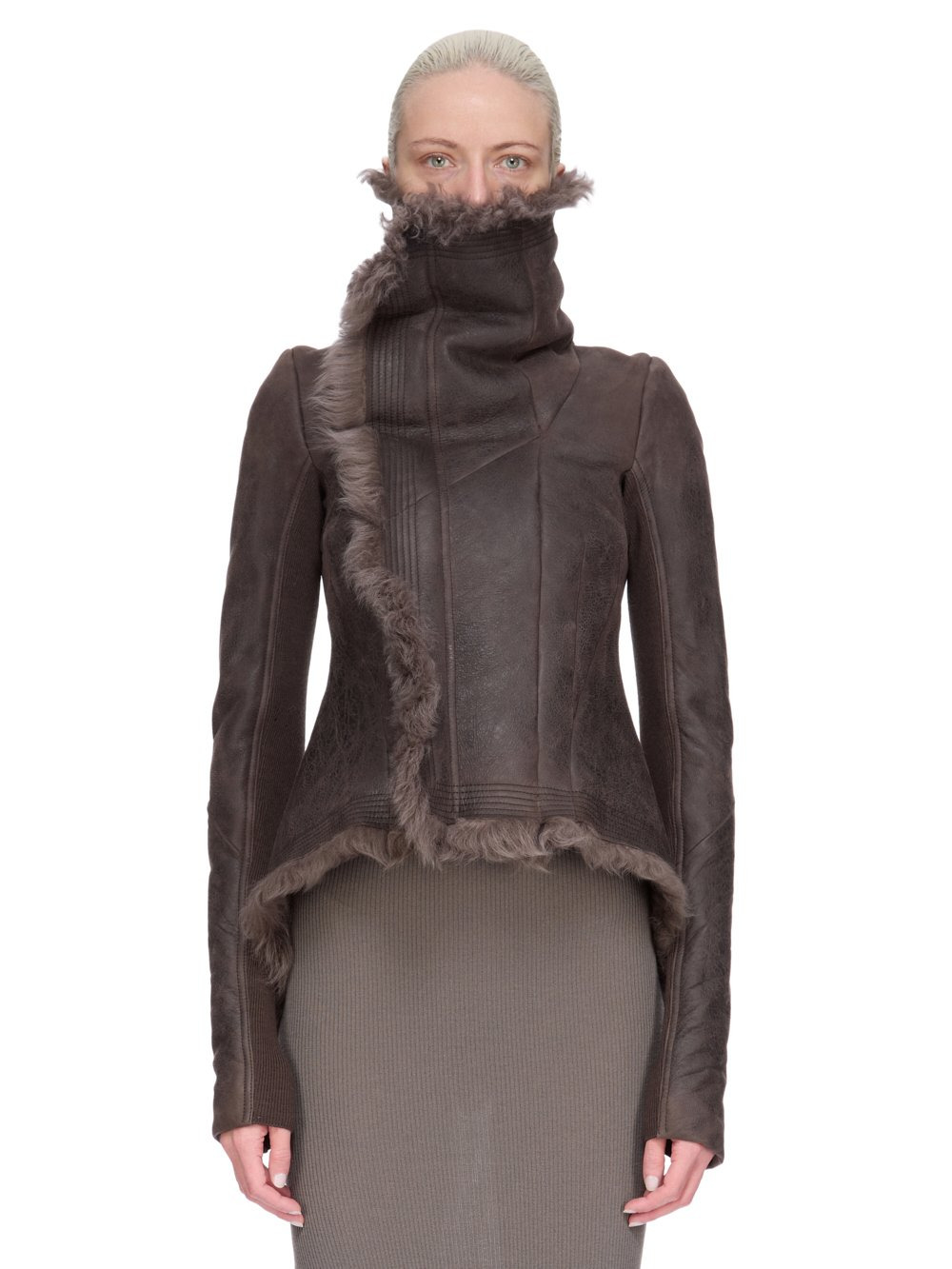 RICK OWENS FW25 CONCORDIANS NASKA BIKER IN DARKDUST TOSCANA SHEARLING THIS NASKA BIKER IS BELOW WAIST LENGTH, IT FEATURES A DOUBLE BREASTED FRONT WITH OFF CENTRE ZIPPER, CREATING A COVER FLAP WHICH CAN BE WORN OPEN AS AN EASY DRAPE, HALF-CLOSED AS A WIDE COLLAR OR FULLY ZIPPERED UP TO CREATE A HIGH FUNNEL NECK. IT HAS LONG SLEEVES, TOPSTITCHING ON SEAMS AND A CURVED NASKA HEMLINE THAT DIPS INTO TWO POINTS AT THE BACK THIS MEDIUMWEIGHT SHEARLING LAMB LEATHER HAS A WAXY NAPPA FINISH AND A SOFT, LONG AND CURLY FUR TANNED IN THE TUSCANY AREA OF ITALY, THESE SHEARLING HIDES ARE OF NORTH SPANISH ORIGIN. THE SPECIFIC CURLY AND LONG HAIR TEXTURE IS ONLY FOUND IN THE BURGOS REGION OF SPAIN. BECAUSE THE HAIR IS NATURAL, THERE WILL BE VARIATIONS IN HAIR LENGTH AND TEXTURE, MAKING EACH PIECE UNIQUE THIS TANNERY IS LWG CERTIFIED WITH A SILVER RATING COLOR: DARKDUST MATERIAL: 100% LAMB SHEARLING REAL FUR KNIT RIB UNDER SLEEVES 100% NEW WOOL ZIPPER EDGE 100% CALF LEATHER SLEEVES LINING 100% CUPRO MODEL IS 181CM TALL MODEL WEARS SIZE 40