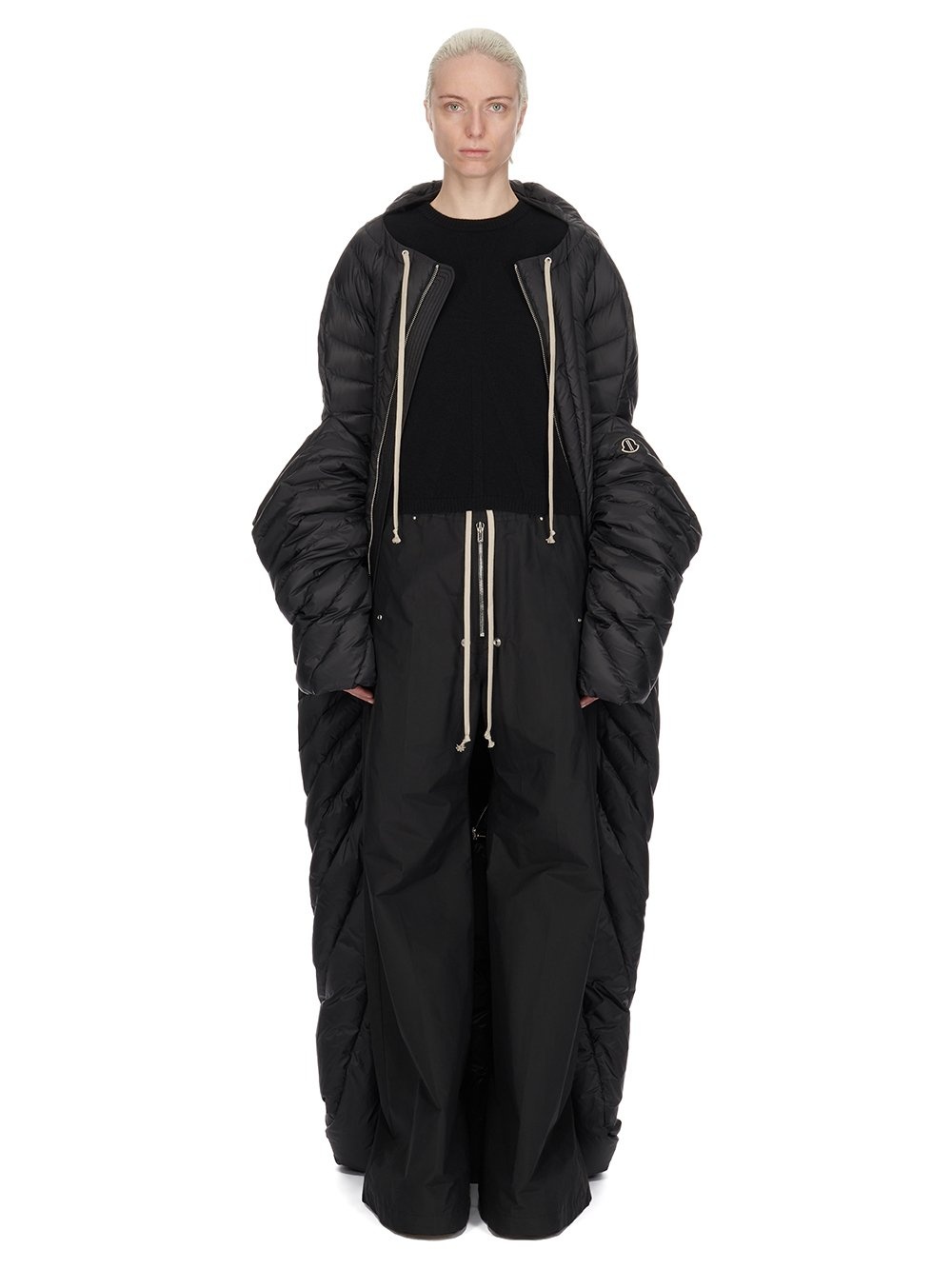 MONCLER + RICK OWENS FW24 RADIANCE SLEEPING BAG IN BLACK RECYCLED LONGUE SAISON WITH QUILTING THIS RADIANCE SLEEPING BAG IS FULL LENGTH. IT CAN BE USED AS A HOODED SLEEPING BAG WITH A CENTRE FRONT ZIPPER AND A DRAWSTRING HOOD. OR IT CAN BE WORN UNZIPPED AND TRAILING BEHIND WITH WIDE SHOULDERS AND LONG DROPPED SLEEVES, WITH RIBBED CUFFS. IT IS A DUVET STYLE THAT FEATURES A RADIANCE QUILTING DESIGN, WITH LINES RADIATING DOWN THE CENTRE FRONT BODY, TO WRAP AROUND AND FINISH AT CENTRE BACK. IT HAS THE MONCLER + RICK OWENS EMBROIDERED LOGO PATCH ON THE UPPER LEFT ARM THIS AIRY AND LIGHTWEIGHT DUVET MATERIAL IS MADE USING CERTIFIED RECYCLED POLYESTER - COLOR: BLACK - MATERIAL: 100% POLYESTER - INSERT 50% NEW WOOL + 50% ACRYLIC - LINING 100% POLYESTER - PADDING 90% GOOSE DOWN + 10% GOOSE FEATHERS - MALE MODEL IS 189 CM TALL, FEMALE MODEL IS 181 CM TALL - ITEM IS AVALIABLE IN ONE SIZE
