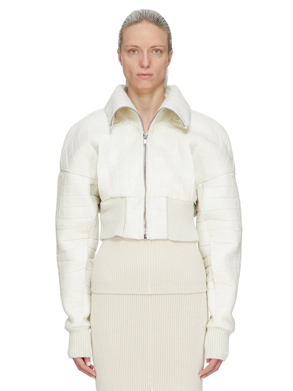 RICK OWENS FW25 CONCORDIANS RUNWAY DRACUCOLLAR CROPPED IN MILK ALBINO ALLIGATOR THIS DRACUCOLLAR CROPPED IS WAIST LENGTH WITH LONG SLEEVES AND A DROPPED SHOULDER. IT HAS A CENTRE FRONT ZIPPER CLOSURE AND A WIDE RIBBED WAISTBAND CUFFS AND A CONCEALED ZIPPER POCKET IN THE LEFT FOREARM. IT FEATURES AN EXTENDED LENGTH COLLAR THAT CAN BE WORN UP OR DOWN AND HOLDS ITS SHAPE THANKS TO IT BEING REINFORCED WITH FUSING MATERIAL. IT IS FULLY LINED AND HAS TWO INTERNAL ZIPPERED POCKETS. THIS GENUINE ALLIGATOR LEATHER IS SOFT WITH A WAXY HANDFEEL SCALE TEXTURE, COLOR AND PATTERN AS WELL AS MARKINGS AND SCRATCHES ARE NATURAL TO THE ANIMAL, THEY ARE SIGNS OF A LONG LIFE IN THE WILD AND WHAT MAKES EACH PIECE UNIQUE ALLIGATOR IS PROTECTED BY THE CITIES AGREEMENT AND REGULATIONS, WHICH MEANS EACH SKIN CAN BE TRACED BACK TO ITS ORIGIN COLOR: MILK MATERIAL:100% ALLIGATOR LEATHER MODEL IS 181CM TALL MODEL WEARS SIZE 40