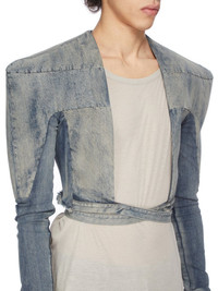 RICK OWENS FW25 CONCORDIANS RUNWAY TIGHT JKT IN DIRTY HUSTLER 14OZ HUSTLER SLUB DENIM THIS TIGHT JKT IS WAIST LENGTH. IT IS CLOSE-FITTING, WITH LONG SLEEVES, AND AN OPEN FRONT THAT SECURES WITH A LONG TIE THAT THEN WRAPS AROUND THE WAIST. IT FEATURES STRUCTURED, WIDE TATLIN SHOULDERS WITH A GIRDERED SHOULDER SEAM, AND YOKE THAT IS HORIZONTAL ACROSS THE CHEST AND DESCENDS DOWN THE ARM, TO FINISH IN A BLUNT POINT AT THE ELBOW THIS MEDIUMWEIGHT HUSTLER DENIM IS MADE ON A 14OZ JAPANESE INDIGO AND NATURAL SLUB DENIM WOVEN IN FUKUYAMA PREFECTURE BY A MILL FOUNDED IN 1893. THE READY GARMENT IS STONE WASHED WITH MINERAL DYES TO ACHIEVE THE HUSTLER WASH THIS FABRIC IS MADE USING GOTS CERTIFIED ORGANIC COTTON WHICH MEANS THE NATURAL FIBER IS GROWN WITHOUT HARMFUL CHEMICALS, LEAVING OUR SOIL, AIR AND WATER CLEANER FROM CONTAMINATES THIS GARMENT IS TREATED IN AN ITALIAN WASH HOUSE BASED IN THE VENETO AREA OF ITALY, THAT PRODUCES IN SMALLER TREATMENT BATHS TO REDUCE WATER WASTE AND UTILIZE A WATER PURIFYING PROCESS THAT ENABLES THEM TO RECYCLE A PORTION OF THE WATER USED. ALL OF OUR DENIM WASHES ARE ZDHC CERTIFIED COLOR: DIRTY HUSTLER MATERIAL: FRONT AND SHOULDERS 100% COTTON BACK AND SLEEVES 91% COTTON + 6% ELASTOMULTIESTER + 3% RUBBER FIBER SHOULDER LINING 97% COTTON MODEL IS 189CM TALL MODEL WEARS SIZE 48
