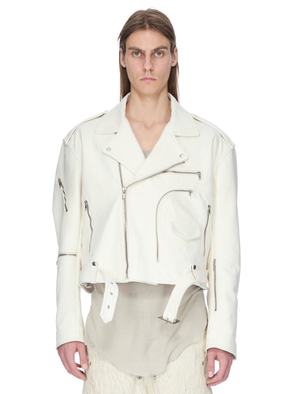 RICK OWENS FW25 CONCORDIANS CROPPED JUMBO BAUHAUS STOOGES IN MILK ALBINO LAMB LEATHER THIS CROPPED JUMBO BAUHAUS STOOGES IS ABOVE-HIP-LENGTH WITH LONG SLEEVES AND AN OVERSIZED FIT. IT FEATURES A BIKER DOUBLE BREASTED FRONT WITH OFF CENTRE ZIPPER A WIDE COLLAR AND LAPEL WITH SILVER SNAPS. IT FEATURES A ROUNDED BAUHAUS ZIPPED POCKET ON THE LEFT SIDE BODY WITH AN ADDITIONAL FLAP POCKET THAT SECURES WITH A CONCEALED SNAP. IT HAS ZIPPED SIDE FRONT POCKETS, AND SIDE BACK POCKETS, A DIAGONAL ZIPPED POCKET ON THE UPPER RIGHT ARM AS WELL AS A HORIZONTAL ZIP AT THE ELBOW, AND A ZIPPED POCKET IN THE LEFT FOREARM. IT HAS ZIP OPENINGS AT THE CUFFS, SHOULDER EPAULETTES WITH SNAP DETAILS AND A BELT RUNNING THROUGH BELT LOOPS AT THE WAISTBANDIT IS FULLY LINED WITH TWO INTERNAL ZIPPED POCKETS. THIS MEDIUMWEIGHT ALBINO LAMB LEATHER HAS A NATURAL AND WAXY HANDFEEL TANNED IN THE NAPLES AREA OF ITALY, THIS LEATHER IS MADE ON A METAL FREE TANNED WHITE BASE, TUMBLED IN ORDER TO BRING OUT THE NATURAL GRAIN TEXTURE OF THE LEATHER AND FINISHED WITH NATURAL WAX BY HAND TO ACHIEVE THE IRREGULAR ALBINO COLORATION BECAUSE THIS SKIN IS NAKED, NOT FINISHED USING ANY PIGMENTS COVERING THE SKIN, NATURAL MARKINGS AND SHADINGS ARE VISIBLE WHICH MAKES EACH SKIN AND PRODUCT UNIQUE COLOR: MILK MATERIAL: 100% LAMB LEATHER BODY AND POCKETS LINING 100% COTTON SLEEVES LINING 100% CUPRO MODEL IS 189CM TALL ITEM IS AVAILABLE IN ONE SIZE
