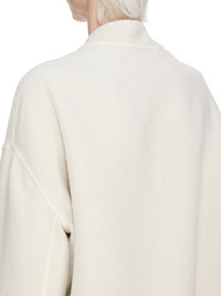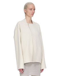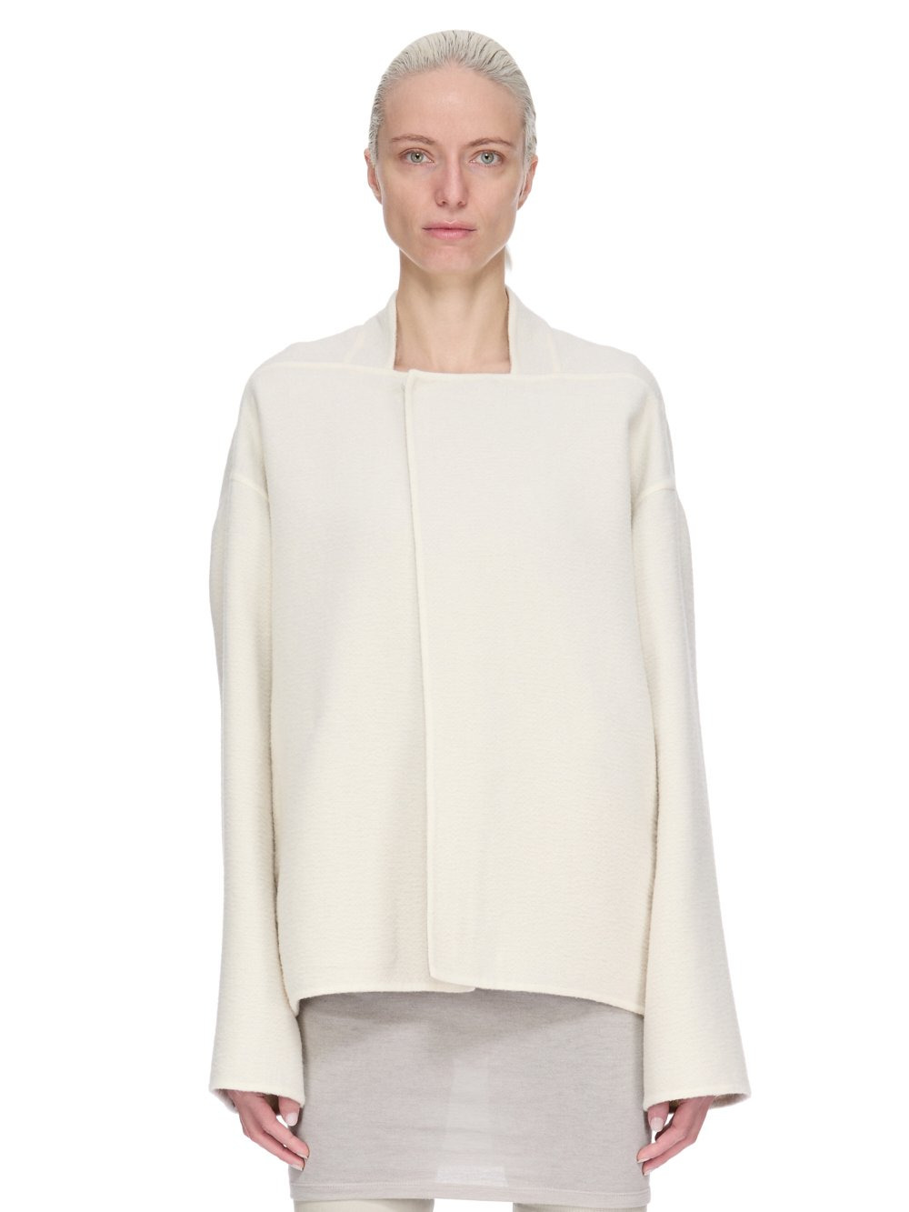 RICK OWENS FW25 CONCORDIANS ISLAND JKT IN MILK/PEARL DOUBLE CAMEL THIS ISLAND JKT IS HIP LENGTH WITH LONG SLEEVES. IT HAS A SHAWL COLLAR WITH A SQUARE NECK AND LEVEL SHOULDER SEAMS. IT HAS A FRONT WRAP WITH CONCEALED SNAPS, A SIDE SEAM POCKETS. IT TAPERS TO THE HEM AND HAS A TRIANGULAR BACK SPLIT THIS HEAVYWEIGHT DOUBLE CAMEL QUALITY IS WOVEN FROM FINE BABY CAMEL YARNS AND FINISHED BY WASHING AND TUMBLING. IT HAS A WARM AND SOFT HANDFEEL THE HIGH GRADE CAMEL HAIR USED IN THIS PRODUCT DERIVE FROM BACTRIAN CAMELS, A LONG HAIRED CAMEL NATIVE TO THE CENTRAL ASIAN STEPPES. INSTEAD OF SHEERING, THE HAIR IS COLLECTED BY BRUSHING THE CAMELS WHEN THEY NATURALLY LOOSE THEIR WINTER COAT COLOR: MILK/PEARL MATERIAL: 97% CAMEL HAIR + 3% NEW WOOL POCKETS LINING 100% COTTON MODEL IS 181CM TALL MODEL WEARS SIZE 40