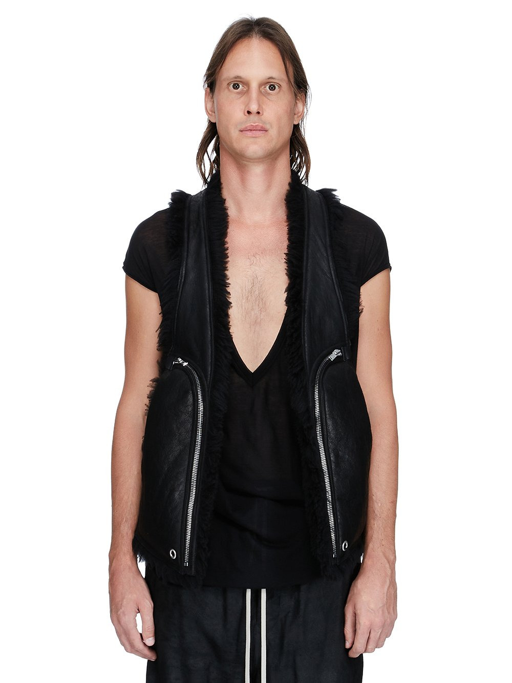RICK OWENS FW25 CONCORDIANS BAUHAUS VEST IN BLACK CURLY SHEARLING THIS BAUHAUS VEST FEATURES TWO FRONT ROUNDED BAUHAUS ZIP POCKETS WITH ADDITIONAL SIDE ZIPPERED POCKETS. ITS SLIM BODY WITH STRAPS SLIPS OVER THE SHOULDERS, AND HAS A HARNESS BACK WITH SECTION OF COTTON WEBBING BETWEEN THE SHOULDER BLADES. IT FEATURES ROUND SILVER EYELETS AND TOPSTITCHING THIS HEAVYWEIGHT SHEARLING LAMB LEATHER HAS A WAXY NAPPA FINISH AND A SOFT NATURAL FUR TANNED IN THE TUSCANY AREA OF ITALY, THESE SHEARLING MERINO HIDES ARE OF SPANISH ORIGIN, THE UNIQUE THICK FUR OF THESE ANIMALS MAKE THEM PERFECT FOR SHEARLING. BECAUSE THE HAIR IS NATURAL, THERE WILL BE VARIATIONS IN HAIR LENGTH AND TEXTURE, MAKING EACH PIECE UNIQUE THIS TANNERY IS LWG CERTIFIED WITH A SILVER RATING COLOR: BLACK MATERIAL: 100% LAMB SHEARLING REAL FUR POCKETS TONGUE 100% COW LEATHER POCKETS LINING 100% COTTON MODEL IS 189CM TALL MODEL WEARS SIZE 48