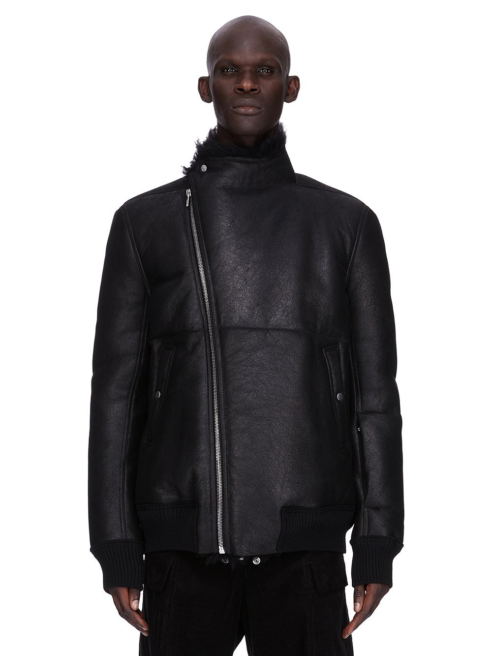 RICK OWENS FW25 CONCORDIANS HOLLYWOOD FLIGHT IN BLACK CURLY SHEARLING THIS HOLLYWOOD FLIGHT IS BELOW HIP LENGTH WITH LONG SLEEVES. IT HAS AN OFF-CENTRE ZIPPER WITH TOP SNAP, A SMALL, ROUNDED, FUNNEL NECK AND RIBBED CUFF AND HEM, AND SIDE SNAP POCKETS AND A ZIPPERED POCKET ON THE LEFT FOREARM. IT FEATURES A DOUBLE SNAP DETAIL ON THE BACK YOKE. THIS VERSION FEATURES A SOFT NATURAL LENGTH SHORT FUR ON THE INSIDE THIS HEAVYWEIGHT SHEARLING LAMB LEATHER HAS A WAXY NAPPA FINISH AND A SOFT NATURAL FUR TANNED IN THE TUSCANY AREA OF ITALY, THESE SHEARLING MERINO HIDES ARE OF SPANISH ORIGIN, THE UNIQUE THICK FUR OF THESE ANIMALS MAKE THEM PERFECT FOR SHEARLING. BECAUSE THE HAIR IS NATURAL, THERE WILL BE VARIATIONS IN HAIR LENGTH AND TEXTURE, MAKING EACH PIECE UNIQUE THIS TANNERY IS LWG CERTIFIED WITH A SILVER RATING COLOR: BLACK MATERIAL: 100% LAMB SHEARLING REAL FUR KNIT RIB CUFFS AND BOTTOM 94% NEW WOOL + 5% NYLON + 1% ELASTANE INSIDE EDGE 100% CALF LEATHER POCKETS LINING 100% COTTON MODEL IS 189CM TALL MODEL WEARS SIZE 48