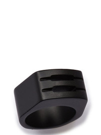 RICK OWENS SS24 LIDO GRILL RING IN BRASS THIS GRILL RING IS A THICK BAND WITH TWO GRILL OPENINGS. IT HAS THE RICK OWENS LOGO ENGRAVED ON THE BACK. THIS JEWLERY PIECE HAS A MATTE BLACK FINISH - COLOR: BLACK - MATERIAL: 100% BRASS - AVAILABLE IN SIZES 52 TO 58 (52-54 SUGGESTED FOR WOMEN AND 56-58 SUGGESTED FOR MEN)