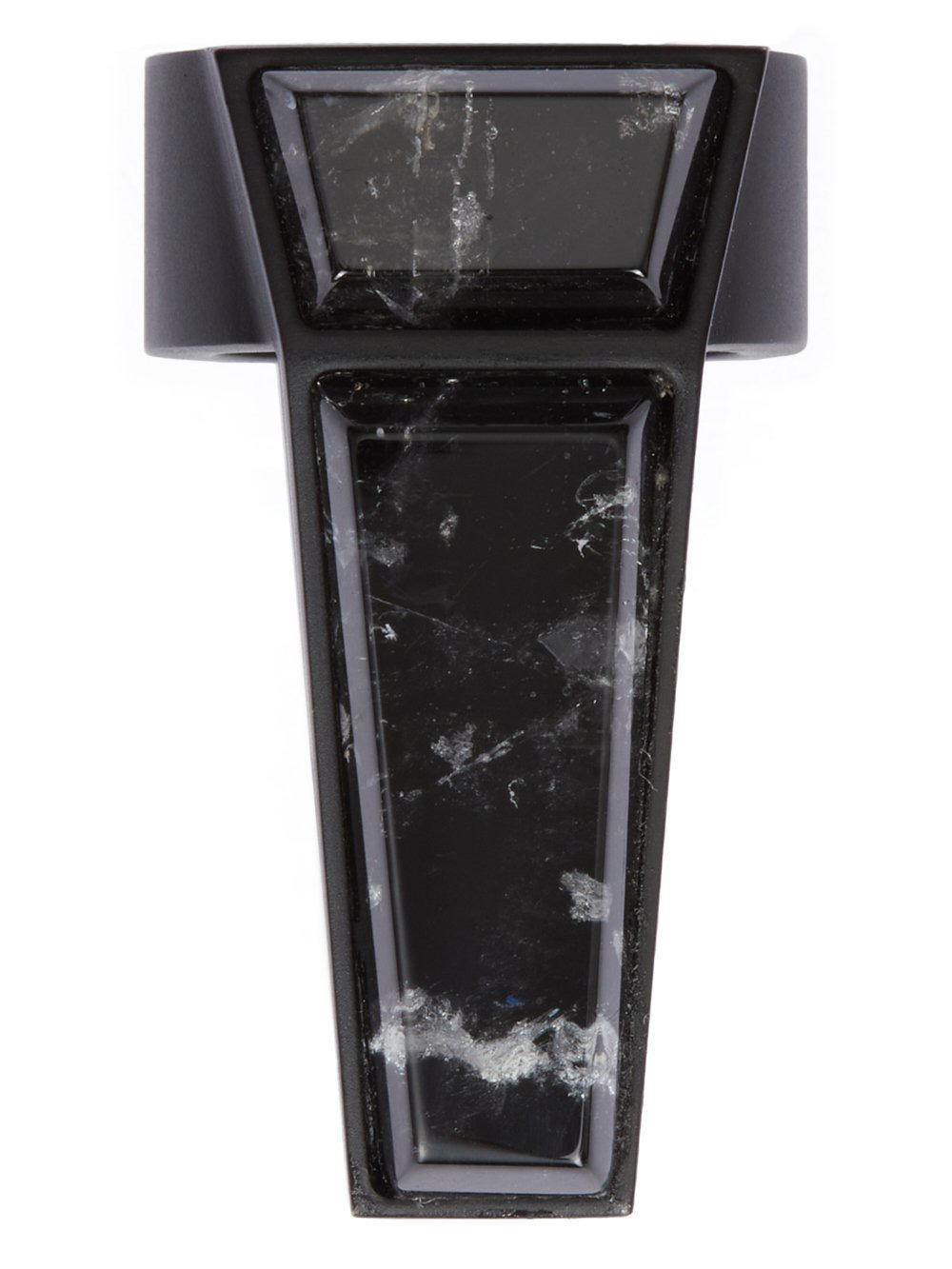 RICK OWENS CRYSTAL TRUNK RING IN BRASS AND ROCK CRYSTAL THIS CRYSTAL TRUNK RING IS A THICK BAND WHICH EXTENDS INTO A GEOMETRIC TRUNK SHAPE WITH BEVELED EDGES, ORNAMENTED WITH TWO RECTANGULAR ROCK CRYSTALS AND THE RICK OWENS LOGO ENGRAVED ON THE BACK.THESE JEWELLERY PIECES ARE CRAFTED WITH THE INDIVIDUAL HANDWORK OF THE ARTISAN, MAKING EACH PIECE UNIQUE - COLOR: BLACK - MATERIAL: 100% BRASS AND ROCK CRYSTAL