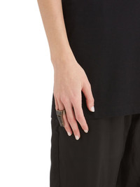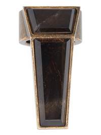 RICK OWENS CRYSTAL TRUNK RING IN BRASS AND SMOKEY QUARTZ THIS CRYSTAL TRUNK RING IS A THICK BAND WHICH EXTENDS INTO A GEOMETRIC TRUNK SHAPE ORNAMENTED WITH TWO BEVELED SMOKEY QUARTZ CRYSTAL STONES. IT HAS THE RICK OWENS LOGO ENGRAVED ON THE BACK. THIS IS THE DARK BRONZE VERSION. THIS JEWELRY PIECE IS MADE USING GENUINE SMOKEY QUARTZ CRYSTAL STONES AND HAS A MATTE DARK BRONZE FINISH THIS FINISH IS OBTAINED BY DARKENING A BRONZE COLOR GALVANIZATION, THE RESULT IS IRREGULAR MEANING EACH PIECE HAVE ITS OWN UNIQUE SHADINGS. THE SMOKEY QUARTZ CRYSTAL STONES USED IN THIS PIECE ARE NATURAL, THEREFORE VARIATIONS IN VEIN STRUCTURE AND COLORATION ARE NOT IMPERFECTIONS OR DEFECTS BUT INHERENT CHARACTERISTICS OF THIS MATERIAL AND WHAT MAKES EACH PIECE UNIQUE. - COLOR: DARK BRONZE - MATERIAL: 100% BRASS - INSERT 100% SMOKY QUARTZ