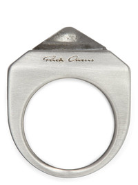 RICK OWENS CRYSTAL PYRAMID RING IN PALLADIO BRASS AND ROCK CRYSTAL THIS CRYSTAL PYRAMID RING IS A THICK BAND WITH BEVELED EDGES ORNAMENTED WITH A PYRAMID SHAPED ROCK CRYSTAL STONE. IT HAS THE RICK OWENS LOGO ENGRAVED IN THE SIDE FACE THIS JEWELRY PIECE IS MADE USING GENUINE ROCK CRYSTAL STONES AND HAS A SEMI-SHINY BRUSHED PALLADIUM FINISH. THE ROCK CRYSTAL STONES USED IN THIS PIECE ARE NATURAL, THEREFORE VARIATIONS IN VEIN STRUCTURE AND COLORATION ARE NOT IMPERFECTIONS OR DEFECTS BUT INHERENT CHARACTERISTICS OF THIS MATERIAL AND WHAT MAKES EACH PIECE UNIQUE. - COLOR: PALLADIO - MATERIAL: 100% BRASS - INSERT 100% ROCK CRYSTAL - AVAILABLE IN SIZES 52 TO 60 (52-54 SUGGESTED FOR WOMEN AND 56-60 SUGGESTED FOR MEN)