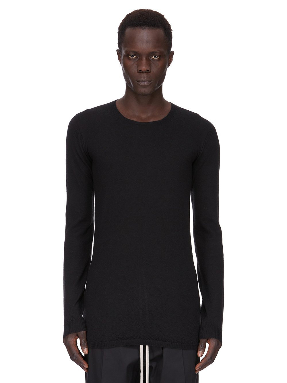 RICK OWENS FOREVER ROUND NECK SWEATER IN BLACK LIGHTWEIGHT RASATO KNIT THIS ROUND NECK SWEATER HAS A BELOW-THE-HIP LENGTH WITH LONG SLEEVES. IT HAS A ROUND NECK WITH RIBBED NECK LINE, CUFFS AND HEM. IT FEATURES A SIGNATURE KNIT LINE RUNNING DOWN THE CENTRE BACK SPINE THIS IS A LIGHTWEIGHT AND SOFT CLASSIC STITCH CASHMERE KNIT - FLAGSHIP STORES AND ONLINE EXCLUSIVE ITEM- COLOR: BLACK.- MATERIAL: 100%CASHMERE- MODEL IS WEARING SIZE: S- MODEL IS 189CM TALL