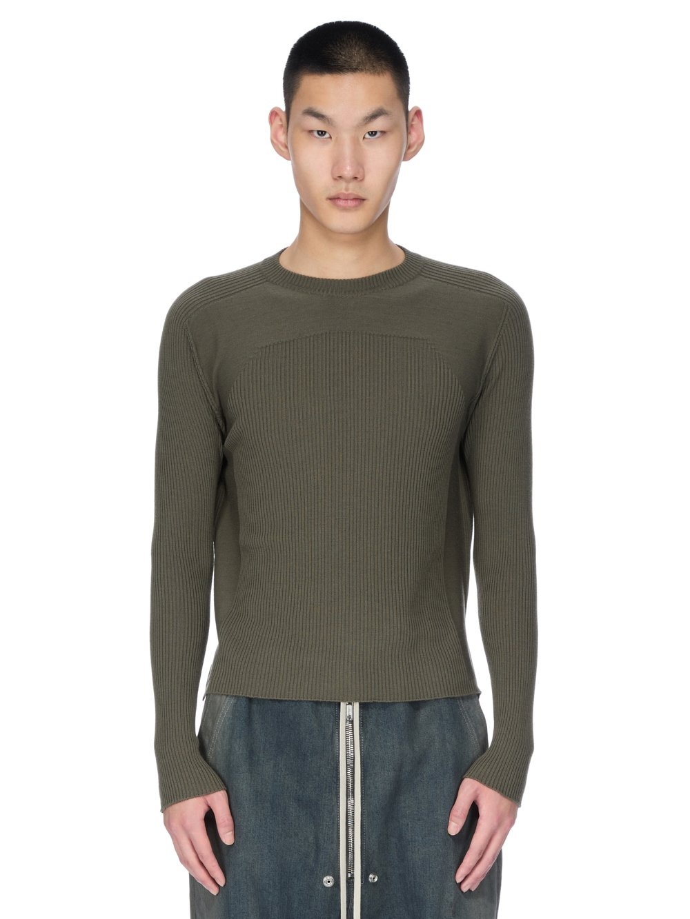 RICK OWENS FW25 CONCORDIANS RIBBED GEO IN BOSCO RIBBED KNIT THIS RIBBED GEO SWEATER IS ABOVE HIP LENGTH WITH A SLIM FIT AND LONG SLEEVES. IT HAS A RIBBED ROUND NECK, BACK AND RIBBED PATTERN ON THE SHOULDERS. IT HAS A CONTRAST FLAT KNIT GEO DESIGN ON THE FRONT CHEST AND SIGNATURE KNIT LINE RUNNING DOWN THE CENTRE BACK SPINE THIS LIGHTWEIGHT AND CLASSIC RIBBED WOOL KNIT HAS A SOFT HANDFEEL COLOR: BOSCO MATERIAL: 100% NEW WOOL MODEL IS 189CM TALL MODEL WEARS SIZE M