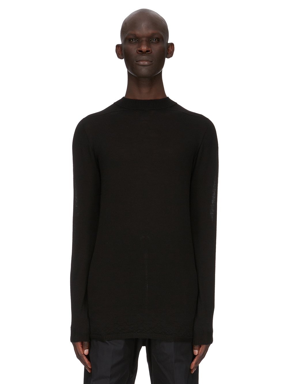 RICK OWENS FW25 CONCORDIANS LEVEL LUPETTO IN BLACK LIGHTWEIGHT RASATO KNIT THIS LEVEL LUPETTO IS HIP LENGTH WITH LONG SLEEVES. IT HAS A SMALL FUNNEL NECK, WITH RIBBED NECK, CUFFS AND HEM. IT FEATURES THE SIGNATURE LEVEL SHOULDER SEAMS AND A KNIT LINE RUNNING DOWN THE CENTRE BACK SPINE THIS LIGHTWEIGHT AND CLASSIC STITCH WOOL KNIT HAS A SOFT HANDFEEL COLOR: BLACK MATERIAL: 100% NEW WOOL MODEL IS 189CM TALL MODEL WEARS SIZE M