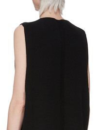 RICK OWENS FW25 CONCORDIANS V TANK IN BLACK RECYCLED CASHMERE THIS V TANK IS HIP LENGTH WITH A SQUARE LOOSE FIT. IT IS SLEEVELESS WITH A DEEP V NECKLINE AND LOW CUT ARMHOLES. IT FEATURES THE SIGNATURE KNIT CHANNEL RUNNING DOWN THE SPINE THIS SOFT CASHMERE KNIT IS MADE FROM RECYCLED YARNS COLOR: BLACK MATERIAL: 97% CASHMERE + 3% WOOL MODEL IS 181CM TALL MODEL WEARS SIZE S