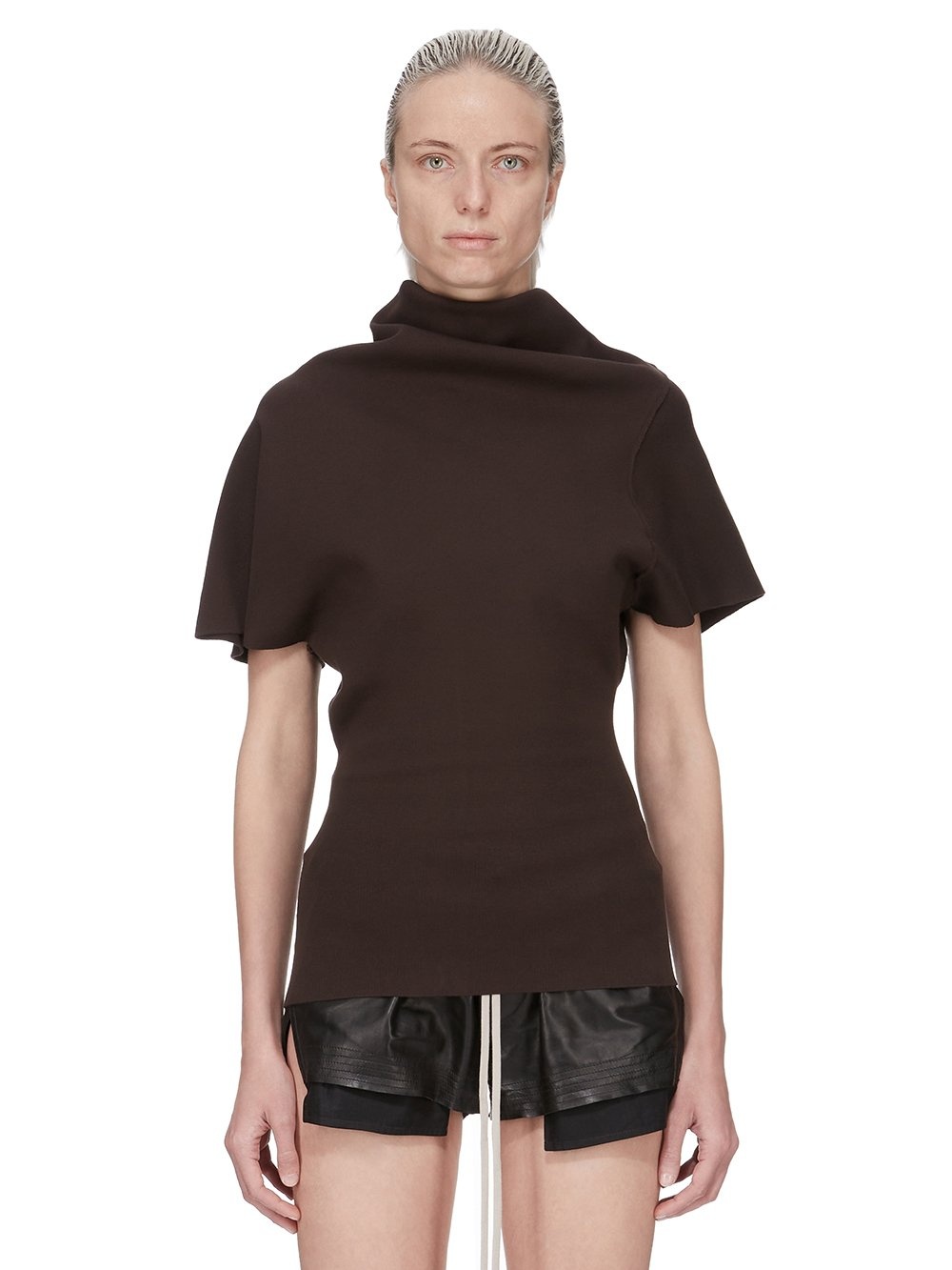 RICK OWENS FW25 CONCORDIANS DRAPED TOP IN BROWN STRETCH VISCOSE KNIT THIS DRAPED TOP IS ABOVE HIP LENGTH AND FEATURES A DRAPED COWL NECK THAT WIDENS INTO AN OPEN BACK NECK. IT HAS THREE BACK SEAMS THAT CREATE A SLIGHTLY OFF-CENTRE DETAIL WITH ABOVE-ELBOW SLEEVES, ONE REGULAR SHOULDER AND THE OTHER WIDER SLEEVE THIS MEDIUMWEIGHT VISCOSE KNIT IS COMPACT WITH A STRETCHY AND DRY HANDFEEL IT IS MADE WITH ECOVERO CERTIFIED VISCOSE WHICH ENSURES THAT THE FIBERS ARE PRODUCED FROM RESPONSIBLY MANAGED PLANTATIONS AND NO DEFORESTATION OCCURS COLOR: BROWN MATERIAL: 63% VISCOSE + 27% POLYESTER + 7% NYLON + 3% ELASTANE MODEL IS 181CM TALL MODEL WEARS SIZE S