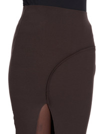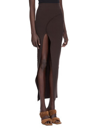 RICK OWENS FW25 CONCORDIANS THERESA SKIRT IN BROWN STRETCH VISCOSE KNIT THIS THERESA SKIRT IS ANKLE LENGTH. IT HAS A ROUNDED PANEL WITH OUTSIDE FACING SEAM, CURVING OVER THE RIGHT HIP TO A RAW CUT ASYMMETRICAL SLIT BEGINNING ON THE LEFT MID-THIGH. IT HAS THE SIGNATURE KNIT LINE RUNNING DOWN THE CENTRE BACK THIS MEDIUMWEIGHT VISCOSE KNIT IS COMPACT WITH A STRETCHY AND DRY HANDFEEL IT IS MADE WITH ECOVERO CERTIFIED VISCOSE WHICH ENSURES THAT THE FIBERS ARE PRODUCED FROM RESPONSIBLY MANAGED PLANTATIONS AND NO DEFORESTATION OCCURS COLOR: BROWN MATERIAL: 63% VISCOSE + 27% POLYESTER + 7% NYLON + 3% ELASTANE MODEL IS 181CM TALL MODEL WEARS SIZE S