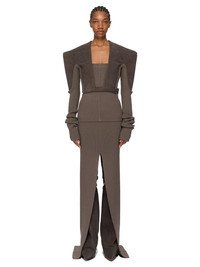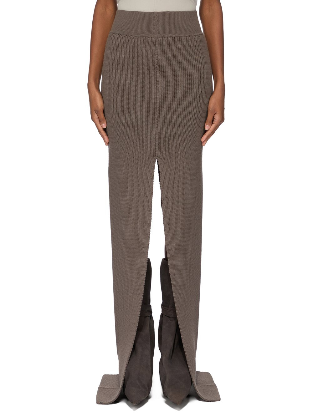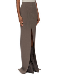 RICK OWENS FW25 CONCORDIANS RUNWAY SLICED SKIRT IN DARKDUST WOOL THIS SLICED SKIRT IS FLOOR LENGTH AT SIDES. IT HAS AN ELASTICIZED WAISTBAND AND A CLOSE TO THE BODY FIT. IT FEATURES TWO HIGH SLITS FRONT AND BACK COLOR: DARKDUST MATERIAL: 100% NEW WOOL MODEL IS 181CM TALL MODEL WEARS SIZE S