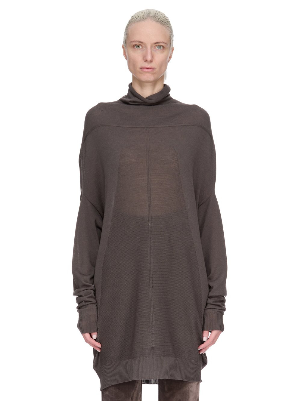 RICK OWENS FW25 CONCORDIANS OVERSIZED CRATER IN DARKDUST LIGHTWEIGHT RASATO KNIT THIS OVERSIZED CRATER IS BELOW HIP LENGTH WITH A JUMBO LOOSE FIT. IT FEATURES A HIGH RIBBED CREW NECK WITH SLIGHT COWL, A WIDE DROPPED SHOULDER AND ARMHOLE WITH LONG RIBBED SLEEVES AND A RIBBED HEM. IT HAS A SIGNATURE KNIT CHANNEL RUNNING DOWN THE CENTRE BACK SPINE THIS LIGHTWEIGHT AND CLASSIC STITCH WOOL KNIT HAS A SOFT HANDFEEL COLOR: DARKDUST MATERIAL: 100% NEW WOOL MODEL IS 181CM TALL MODEL WEARS SIZE S