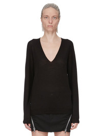 RICK OWENS FW25 CONCORDIANS V NECK PULL IN BLACK LIGHTWEIGHT RASATO KNIT THIS V NECK PULL IS BELOW HIP LENGTH WITH LONG SLEEVES. IT HAS A DEEP V NECK WITH SLIM KNIT EDGE AND RIBBED HEM AND CUFFS. IT FEATURES A SIGNATURE KNIT LINE RUNNING DOWN THE CENTRE BACK SPINE THIS LIGHTWEIGHT AND CLASSIC STITCH WOOL KNIT HAS A SOFT HANDFEEL COLOR: BLACK MATERIAL: 100% NEW WOOL MODEL IS 181CM TALL MODEL WEARS SIZE S
