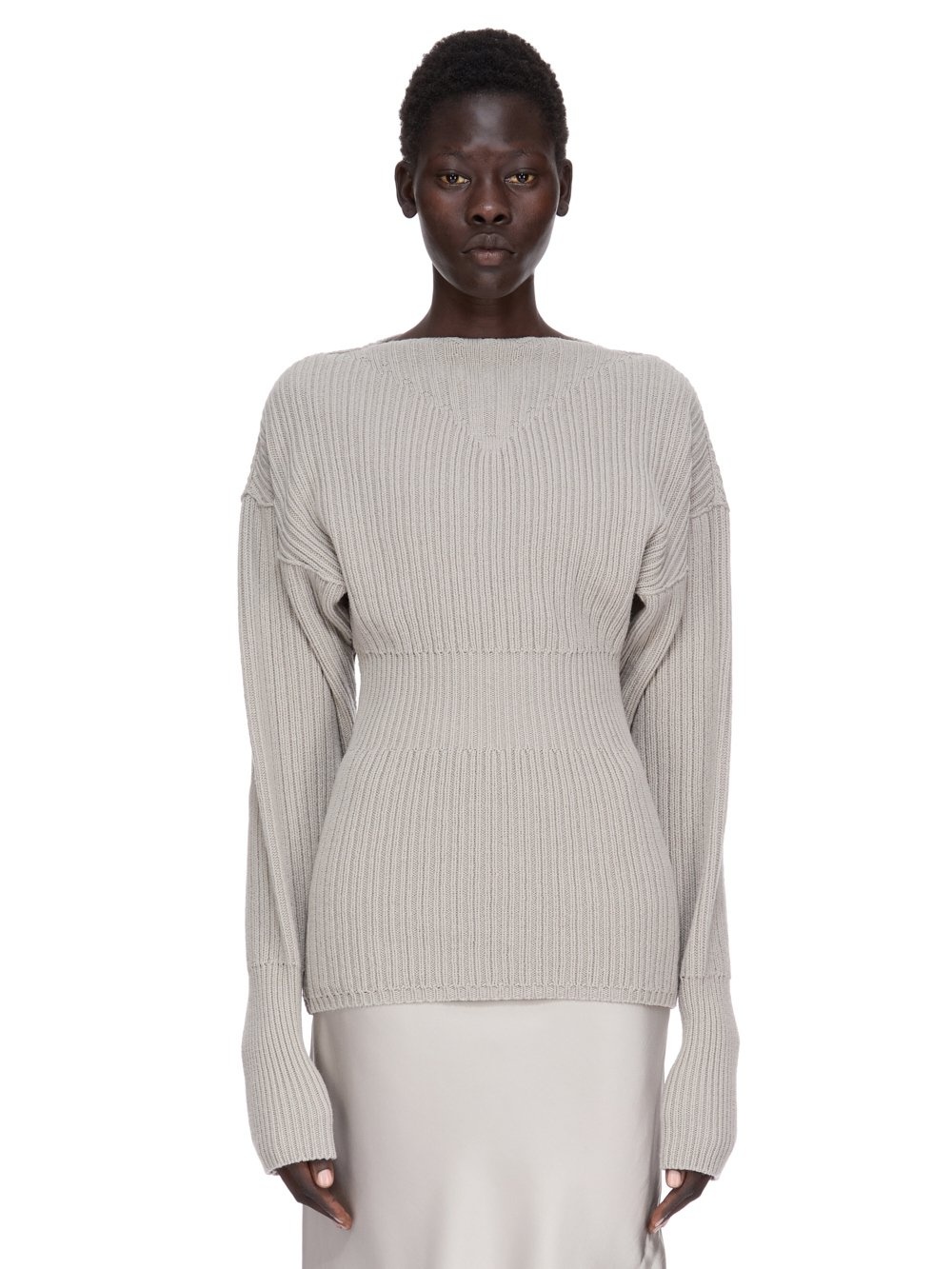 RICK OWENS FW25 CONCORDIANS DAFNE IN PEARL HEAVY WOOL KNIT THIS DAFNE IS BELOW HIP LENGTH WITH LONG SLEEVES. IT HAS A ROUNDED FIT WHICH CINCHES INTO THE WAIST WITH A WIDE RIB JACQUARD, A RAISED BOAT NECK, WIDE SHOULDERS AND LOOSE SLEEVES THAT NARROW TO SLIM CUFFS. IT FEATURES A MEGARIB KNIT DESIGN, WITH A WIDE VERTICAL RIB THE BACK AND FRONT BODY, AND DIAGONAL LINES RUNNING DOWNWARDS INTO THE CENTRE FRONT. IT HAS A VERTICAL RIB BACK WITH THE SIGNATURE KNIT CHANNEL RUNNING DOWN THE CENTRE BACK SPINE THIS A HEAVY WOOL FISHERMAN KNIT COLOR: PEARL MATERIAL: 100% NEW WOOL MODEL IS 181CM TALL MODEL WEARS SIZE S