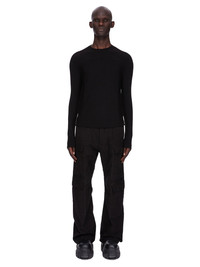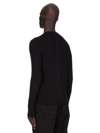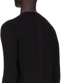 RICK OWENS FW25 CONCORDIANS RIBBED GEO IN BLACK RIBBED KNIT THIS RIBBED GEO SWEATER IS ABOVE HIP LENGTH WITH A SLIM FIT AND LONG SLEEVES. IT HAS A RIBBED ROUND NECK, BACK AND RIBBED PATTERN ON THE SHOULDERS. IT HAS A CONTRAST FLAT KNIT GEO DESIGN ON THE FRONT CHEST AND SIGNATURE KNIT LINE RUNNING DOWN THE CENTRE BACK SPINE THIS LIGHTWEIGHT AND CLASSIC RIBBED WOOL KNIT HAS A SOFT HANDFEEL COLOR: BLACK MATERIAL: 100% NEW WOOL MODEL IS 189CM TALL MODEL WEARS SIZE M