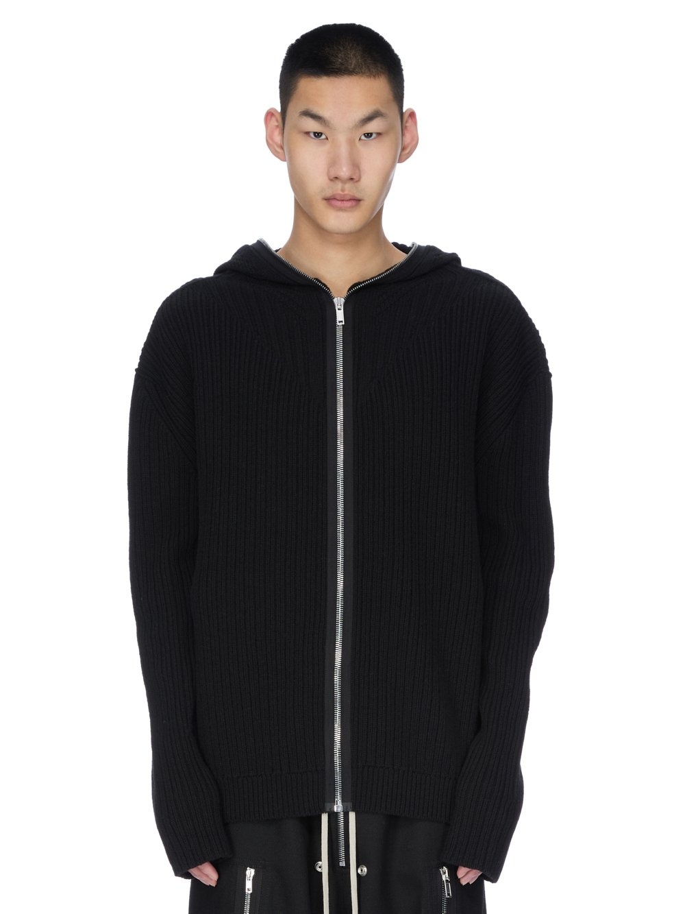 RICK OWENS FW25 CONCORDIANS ZIPPED HOODIE IN BLACK HEAVY WOOL KNIT THIS GIMP HOODIE IS HIP LENGTH WITH LONG SLEEVES. IT HAS A FRONT ZIPPER CLOSURE WITH EXPOSED ZIPPER TAPE THAT RUNS FROM THE HEM ALL THE WAY UP THROUGH THE HOOD, ALLOWING IT TO BE ZIPPERED COMPLETELY CLOSED OVER THE FACE. IT HAS A KNIT MOTIVO ON FRONT CHEST, A RIBBED KNIT HEM, AND A SINGLE SEAM RUNNING DOWN THE CENTRE BACK SPINE THIS IS A HEAVY WOOL FISHERMAN KNIT COLOR: BLACK MATERIAL: 100% NEW WOOL MODEL IS 189CM TALL MODEL WEARS SIZE M