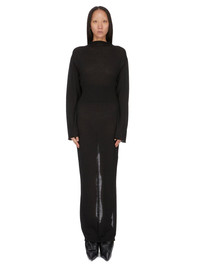 RICK OWENS SS26 TEMPLE CON DRESS IN BLACK LIGHTWEIGHT RASATO KNIT THIS CON DRESS IS FLOOR LENGTH AT FRONT WITH A BACK SLIT TO ABOVE KNEE HEIGHT. IT HAS A WIDE RIBBED WAISTBAND THAT CINCHES THE DRESS INTO THE WAIST. IT HAS LONG, WIDE KIMONO-LIKE CAPE SLEEVE, SO THE ARMS CAN BE WORN IN OR OUT. IT HAS A HIGH NECK WITH A ROLLED EDGE. IT FEATURES A SIGNATURE KNIT LINE RUNNING DOWN THE CENTRE BACK SPINE. THIS LIGHTWEIGHT AND CLASSIC STITCH WOOL KNIT HAS A SOFT HANDFEEL. COLOR: BLACK MATERIAL:100% NEW WOOL MODEL IS 181CM TALL MODEL WEARS SIZE S