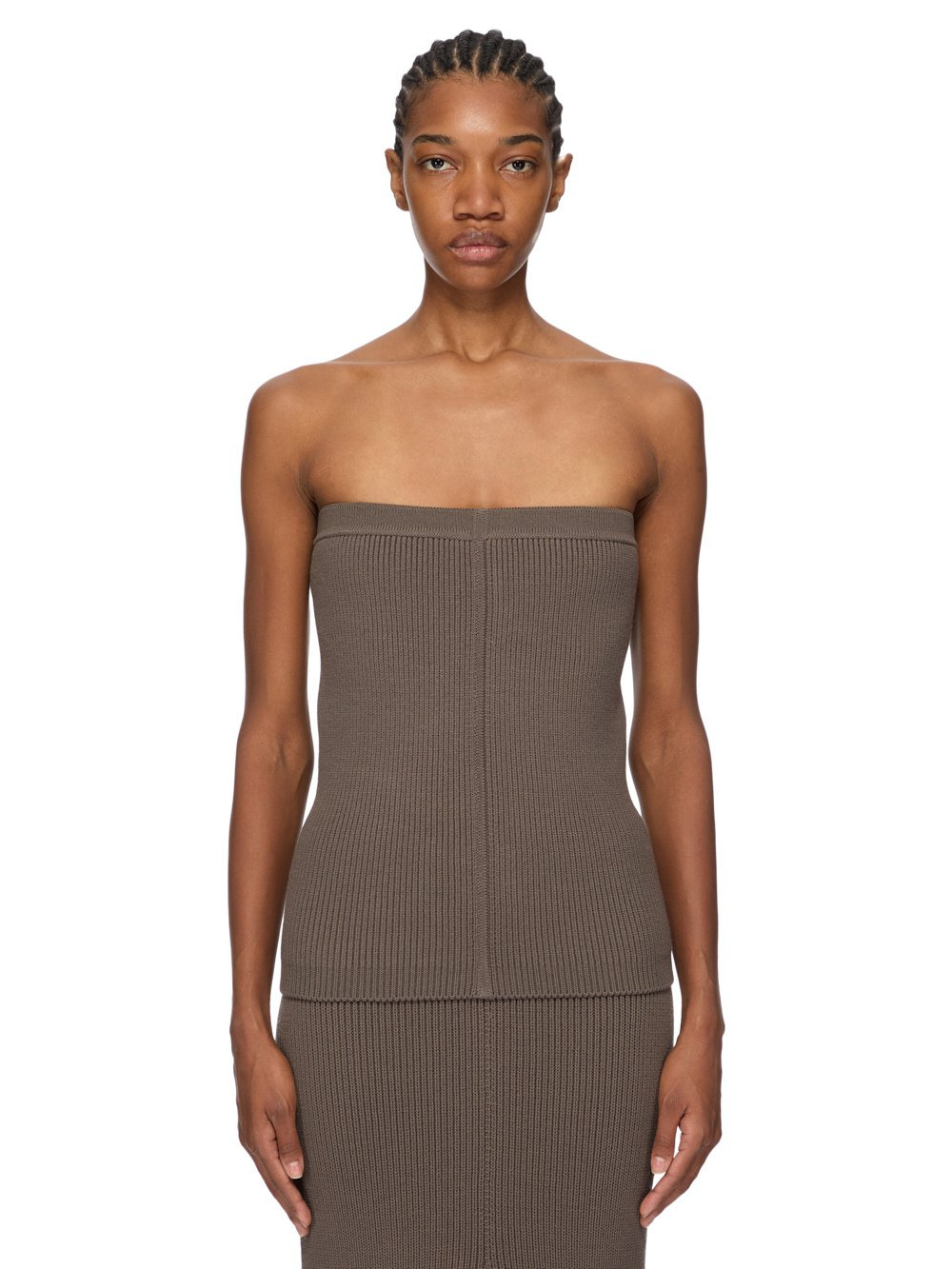 RICK OWENS FW25 CONCORDIANS RUNWAY TUBE TOP IN DARKDUST WOOL THIS BANDEAU TOP IS A SIMPLE TIGHT KNIT TUBE TOP FINISHING BELOW THE HIP. T HAS A FRONT SEAM AND A SIGNATURE CHANNEL RUNNING DOWN THE SPINE COLOR: DARKDUST MATERIAL: 97% NEW WOOL + 2% NYLON + 1% ELASTANE MODEL IS 181CM TALL MODEL WEARS SIZE S