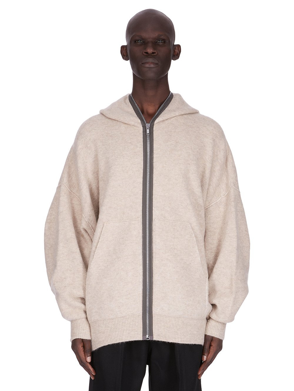 RICK OWENS FW25 CONCORDIANS RUNWAY GIMP HOODIE IN DNA DUST ALPACA KNIT THIS GIMP HOODIE IS MID THIGH LENGTH WITH AN OVERSIZE FIT. IT HAS LONG SLEEVES WITH LOW SHOULDERS AND A DROPPED ARMHOLE, A LARGE HOOD AND TWO FRONT PATCH POCKETS. IT FEATURES IT HAS A FRONT ZIPPER CLOSURE THAT RUNS FROM THE HEM ALL THE WAY UP THROUGH THE HOOD, ALLOWING IT TO BE ZIPPED COMPLETELY CLOSED OVER THE FACE THIS IS A DENSE BUT LIGHT KNIT WITH A SOFT SLIGHTLY FLUFFY HAND COLOR: DNA DUST MATERIAL: 48% ALPACA + 30% NYLON + 20% WOOL + 2% ELASTANE MODEL IS 189CM TALL MODEL WEARS SIZE L