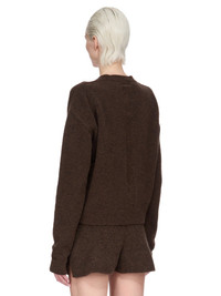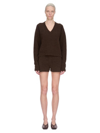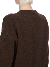 RICK OWENS FW25 CONCORDIANS TOMMY V NECK IN BROWN ALPACA KNIT THIS TOMMY V NECK IS HIP LENGTH WITH AN OVERSIZED FIT. IT HAS LONG SLEEVES WITH WIDE SHOULDERS AND A DROPPED ARMHOLE. IT HAS A RIBBED V NECK AND HEM, SIGNATURE FRONT LEVEL SHOULDER LINE AND KNIT CHANNEL RUNNING DOWN THE CENTRE BACK SPINE THIS A DENSE BUT LIGHT KNIT WITH A SOFT SLIGHTLY FLUFFY HAND COLOR: BROWN MATERIAL: 48% ALPACA + 30% NYLON + 20% WOOL + 2% ELASTANE MODEL IS 181CM TALL MODEL WEARS SIZE S