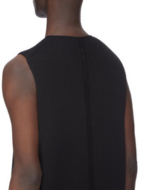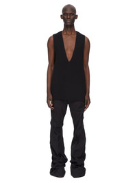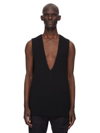 RICK OWENS FW25 CONCORDIANS RUNWAY V TANK IN BLACK WOOL THIS V TANK IS HIP LENGTH WITH A SQUARE LOOSE FIT. IT IS SLEEVELESS WITH A DEEP V NECKLINE AND LOW CUT ARMHOLES. IT FEATURES THE SIGNATURE KNIT CHANNEL RUNNING DOWN THE SPINE COLOR: BLACK MATERIAL: 100% NEW WOOL MODEL IS 189CM TALL MODEL WEARS SIZE L